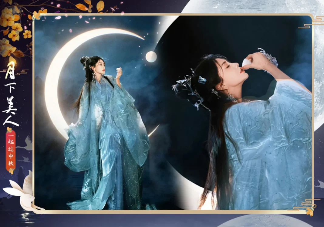 值得一提的是,杨颖的另一套嫦娥服饰则增添了一丝清冷的氛围。当她坐在明亮的月光下细细品味着美酒,浇愁畅谈之时,嫦娥的楚楚动人愈显得淋漓尽致。相较之前的服饰,这一款更具神秘感,使得她看起来如月光下的精灵,既清冷又妩媚。