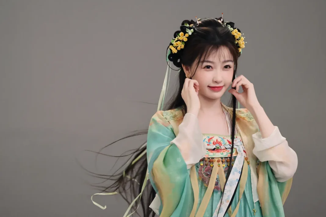 在刚刚发布的古装花絮照中,虞书欣以一袭绿黄渐变色的襦裙展现了她独特的古装魅力。照片中,她的娇憨灵动令人惊艳,尤其是脸颊上那比心的笑容,更是充满了甜美可爱的气息。这一整套造型,不仅突显了她的青春气息,也彰显了古典之美。