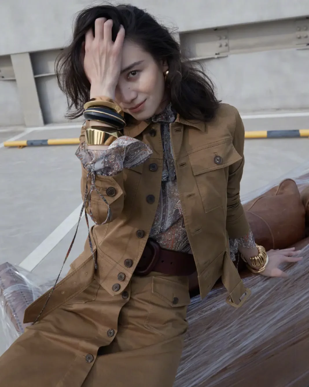 在造型中,夸张的复古腰带为土褐色的全套服装注入了视觉重心。这种设计能够打破单调,让低饱和度的颜色在整体造型中焕发活力。此外,叠戴的手串也增添了粗犷的元素,呼应了曲线与简洁的设计,相得益彰。当宋佳在街头扭头回眸时,职场女强人的形象深入人心,智慧与魅力交织而成。