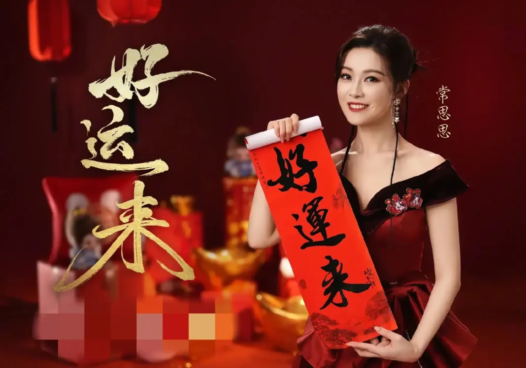 在演出中,常思思身穿一袭红色长裙,红色象征着吉祥与好运,与歌曲的主题完美契合。她手持红色春联,进一步强调了浓厚的年味。这不仅是对新年的祝福,也是对中国传统文化的致敬。无论是舞台表现还是服装选择,常思思都体现出了对新年文化的深刻理解和热爱。