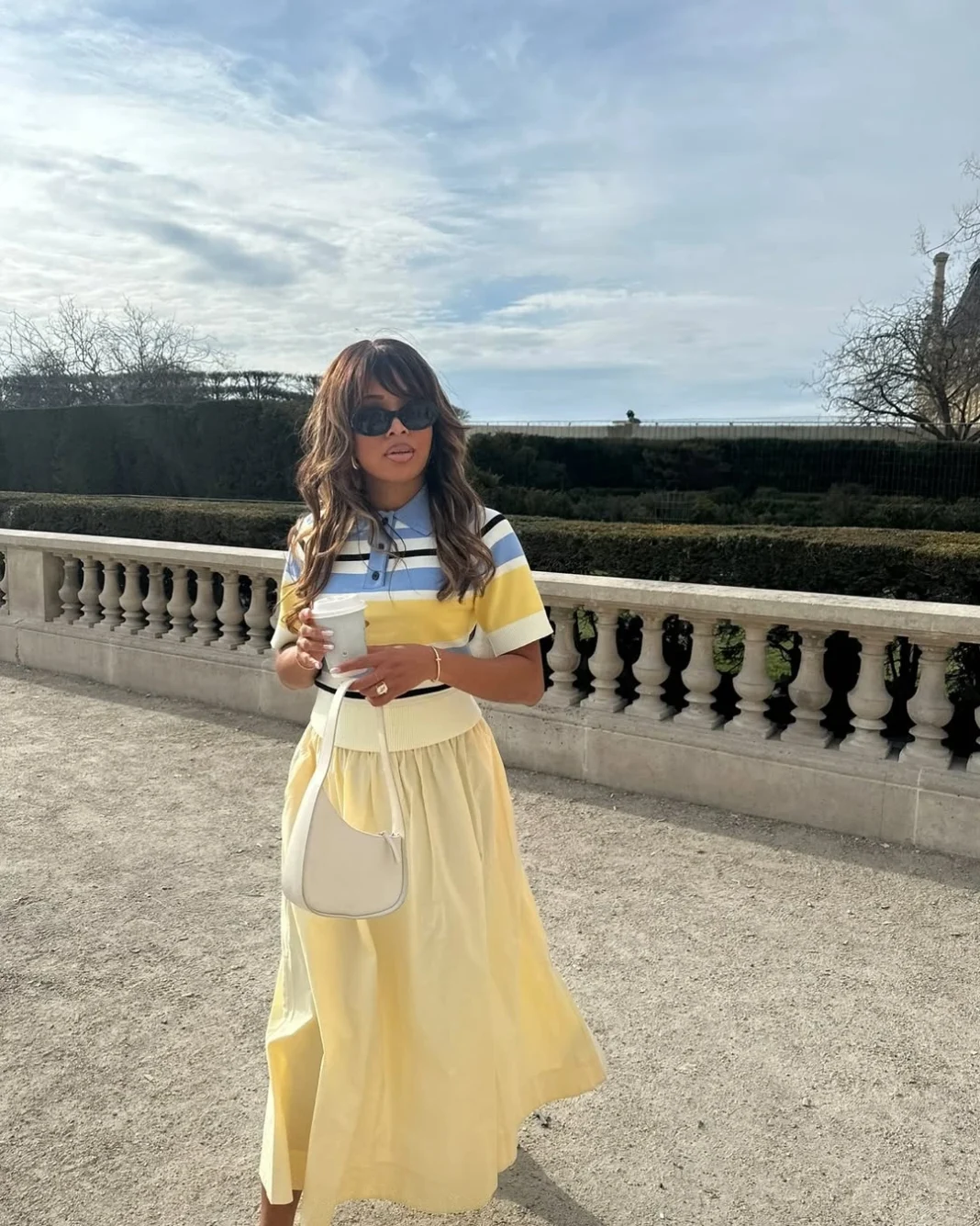 将明亮的淡黄色与经典的 A 字裙搭配,可以营造出一种既休闲又优雅的风格。 A 字裙的剪裁设计能够很好地展现女性的曲线,同时增添几分优雅。而搭配颜色协调的横条纹 Polo 衫,既符合流行趋势,又能为整体造型带来活力。