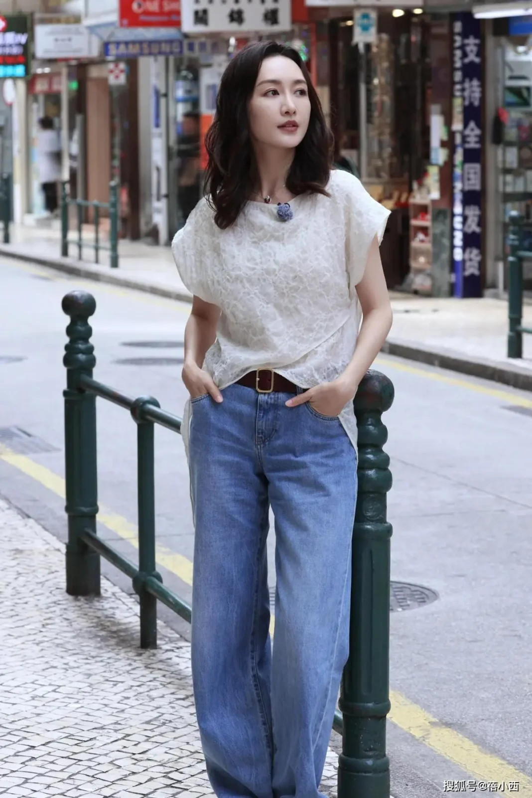 在下身的搭配上,王鸥选择了一条宽松的牛仔裤。经典淡蓝色的牛仔裤搭配棕色皮带,为整体造型注入了复古的气息。这种牛仔裤的版型标准,既百搭又能展现出王鸥的时尚品位。整体穿搭让她在时尚的舞台上,依旧散发出独特的个人魅力。
