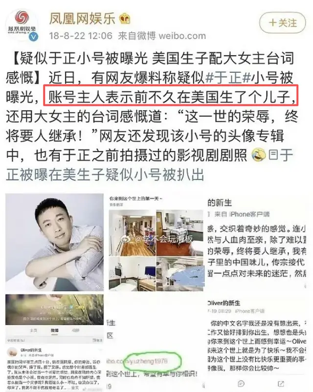 事实上,“于正疑似有孩子”并非第一次传出。早在2018年,凤凰娱乐就曾曝光过相关线索。当时有网友提供证据,指出一个名为“Oliver的新生”的微博小号疑似属于于正,该账号几乎全部内容都与孩子相关。从“孩子出生后的忐忑与迷茫”,到“希望儿子能继承家族荣辱”,字里行间都带有强烈的个人情感色彩,甚至不少网友直呼文字风格“十足是于正的味道”。