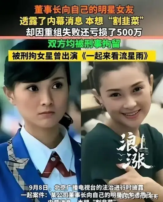 近日,女演员楚轶男因涉嫌内幕交易被刑事拘留的消息引发社会广泛关注。9月8日,北京广播电视台《法治进行时》栏目披露,某公司董事长向其明星女友透露内幕信息,双方本欲通过内幕交易获利,却因重大资产重组失败导致亏损500万元,最终均被警方刑拘。多方消息确认,涉事女明星正是楚轶男,其男友则为科瑞天诚董事长郑跃文。