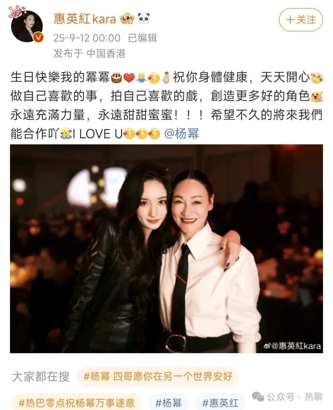 演员惠英红晒出与杨幂的合影,并送上深情祝愿:“做自己喜欢的事,拍自己喜欢的戏,创造更多好的角色,永远充满力量,永远甜甜蜜蜜。”她还表达了希望未来能有合作机会的期待,尽管两人尚未正式合作,但私下感情显然深厚。
