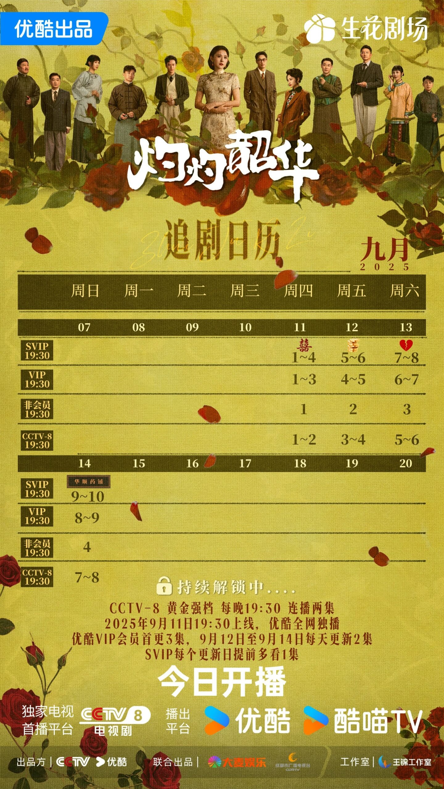 从2025年9月11日开始,观众可以在CCTV8频道每晚19:30观看两集的《灼灼韶华》。在首播的当天,前两集将首次亮相;之后的每晚将持续为大家献上精彩剧集,预计在9月28日迎来大结局。
