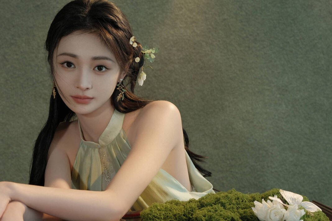 除了美丽的刺绣裙,周洁琼的发间饰花也为她的造型加分不少。细腻的花饰与淡绿色的裙装相得益彰,使整个造型显得更加协调而富有层次感。这种搭配不仅展现了她古典优雅的气质,同时也赋予了她一种现代感。