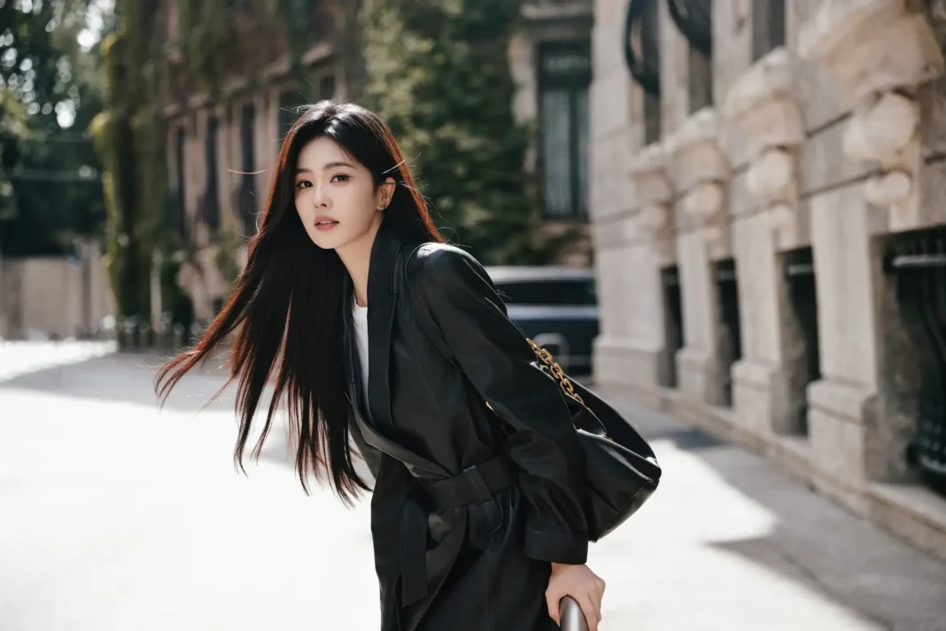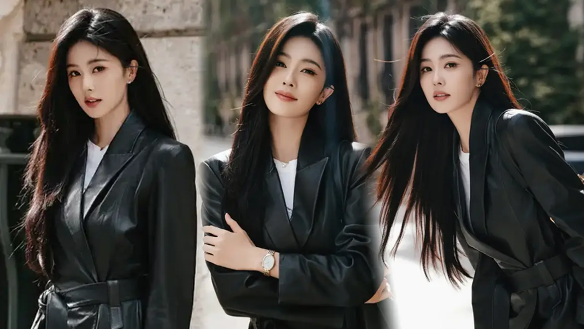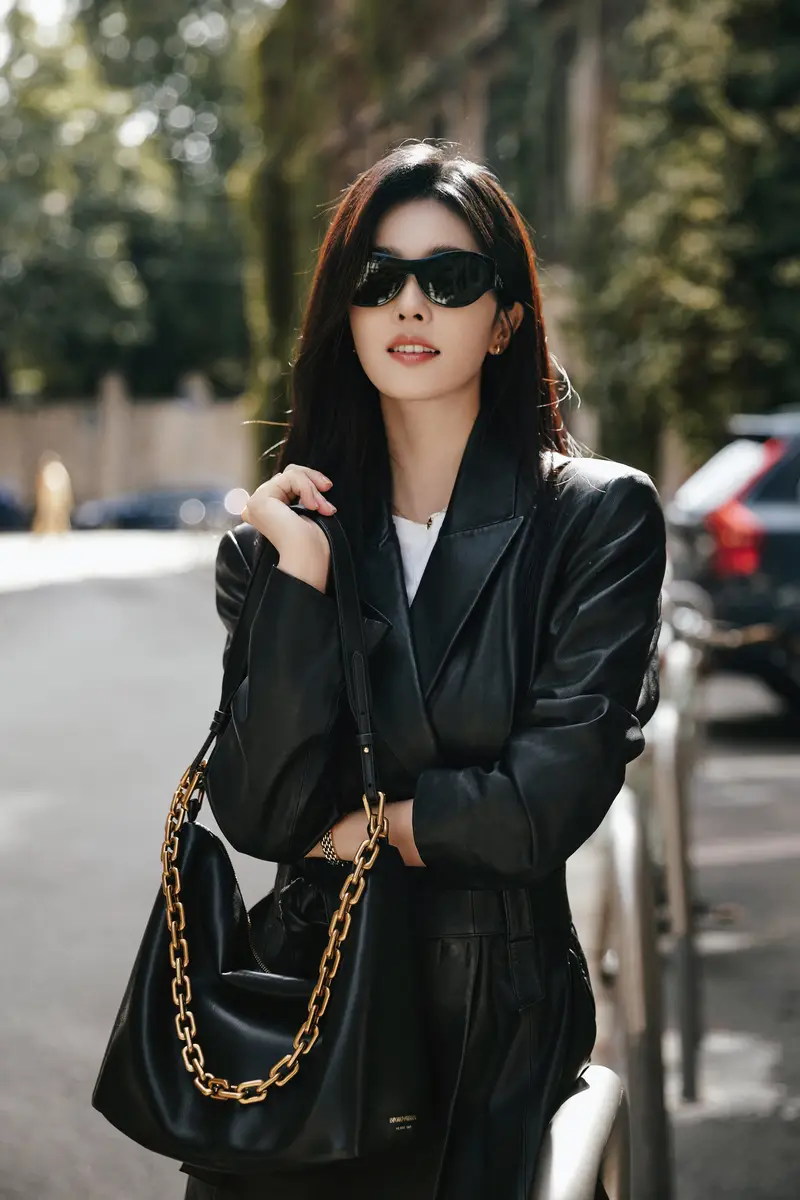 黑色皮衣作为时尚界的经典单品,能够轻松传递出一种低调奢华的感觉。白鹿的黑色西装设计简洁而干练,让她看起来既不失优雅又富有个性。这样的搭配在微风中更显慵懒与迷人的气质,为她增加了几分神秘感。