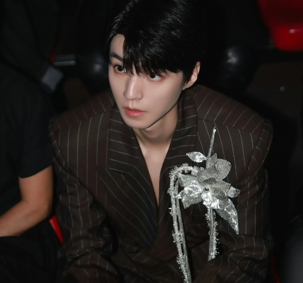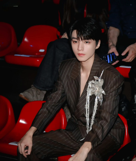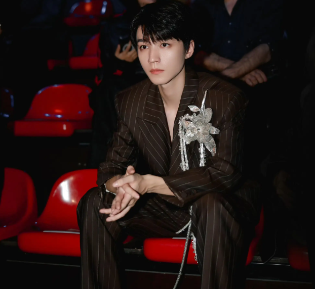 王俊凯身着的David Koma 2026春夏系列的西装,以赭石棕与米白色的细条纹设计,完美彰显了他的身形。西装的深V领口设计将优雅与性感巧妙结合,深深吸引了现场观众的目光,成为时装周的一大亮点。