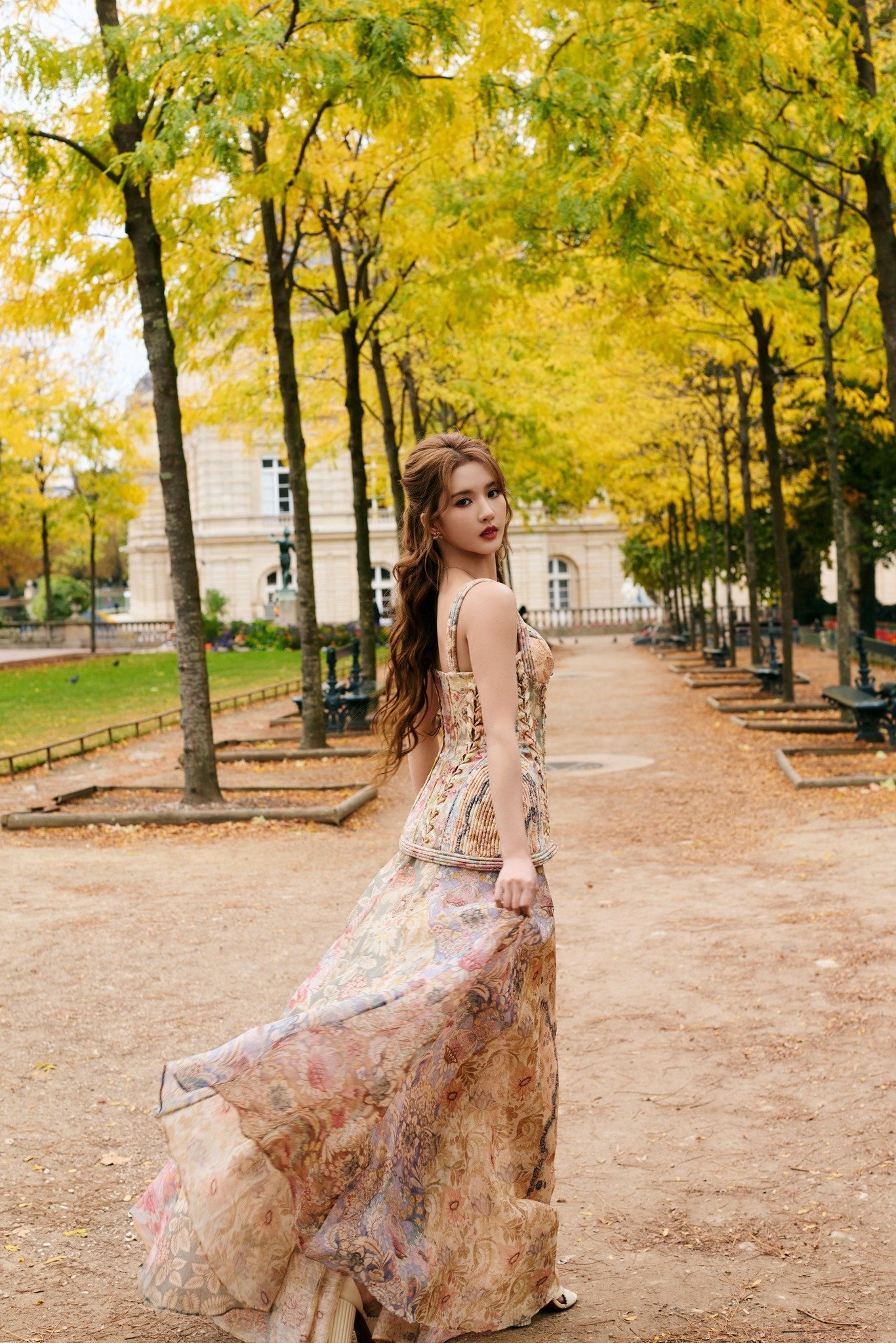 在最近的巴黎时装周上,刘些宁令人惊艳的造型引起了广泛关注。她穿着一条印花复古长裙,仿佛是从一幅油画中走出来的公主,彰显出独特的优雅和随性的氛围。
