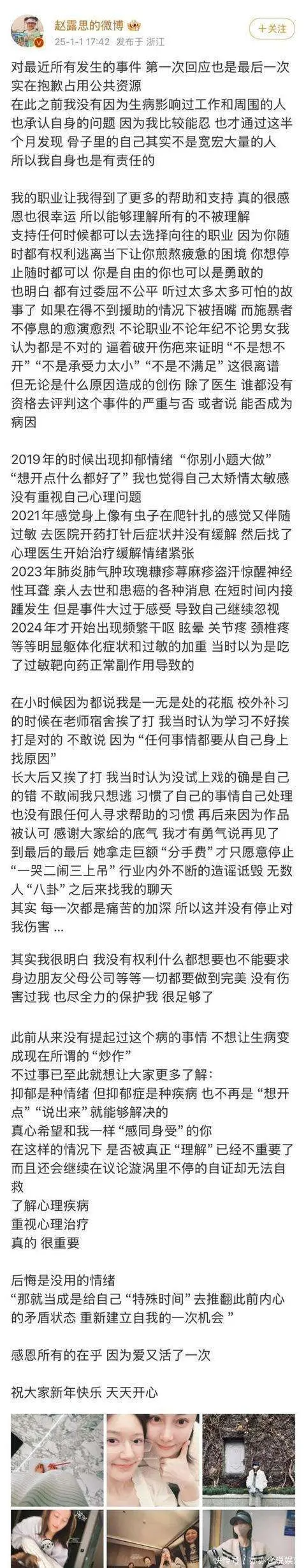 2025年元旦,赵露思在社交平台发文,首次回应健康状况。她透露自2019年起患抑郁症,2021年加重后开始接受治疗,2023年因亲人去世病情再度恶化。2024年出现严重躯体化症状,影响生活自理。她在文中表示,自己也有责任,工作受挫带来的打击难以排解。