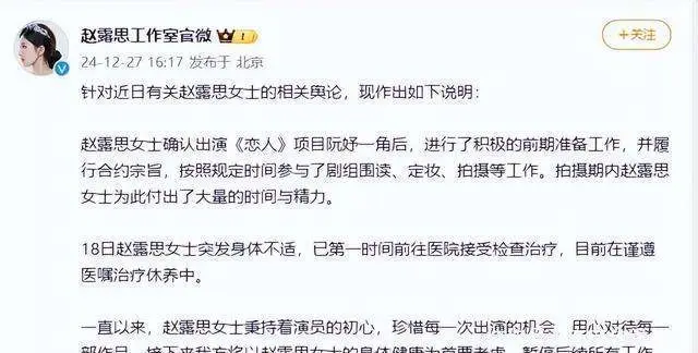 随后,经纪公司发表声明称将“艺人健康放在首位”,但未提具体措施,引发质疑。有业内人士指出,赵露思积压的影视与代言合同若无法履行,或面临违约风险,成为公司焦虑的根本原因。