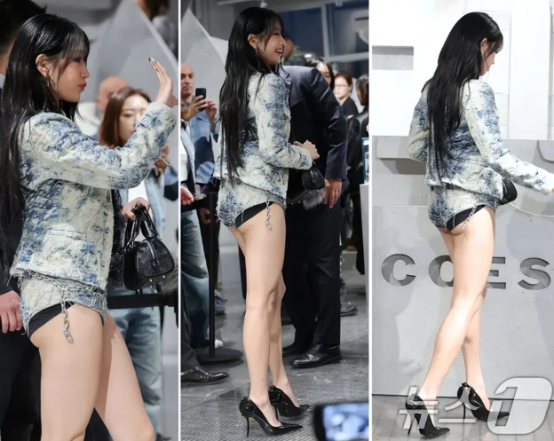 当天,NATTY身穿撕裂纹理牛仔夹克、超短运动裤与黑色背心亮相,造型大胆前卫,却因热裤长度过短、臀线若隐若现而成为全场焦点。