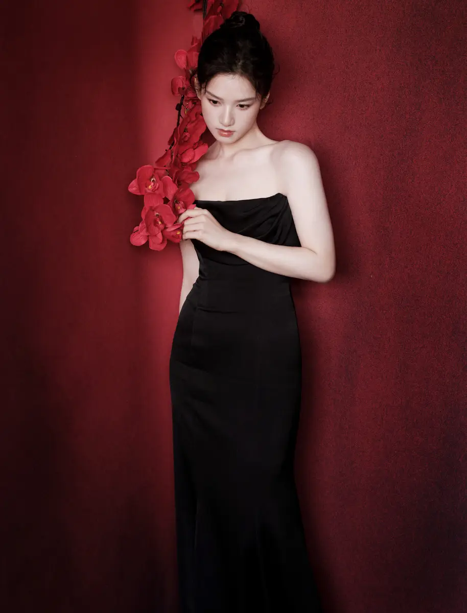 黑色裙子象征着经典与优雅,张婧仪对此的演绎更是为这件单品注入了生命。她微微闭上双眼,脸上挂着浅浅的笑容,似乎在享受这一刻的静谧与安宁。手中的红花则为整体造型增添了一抹生动的色彩,使得这个造型在优雅中又流露出灵动的气息。
