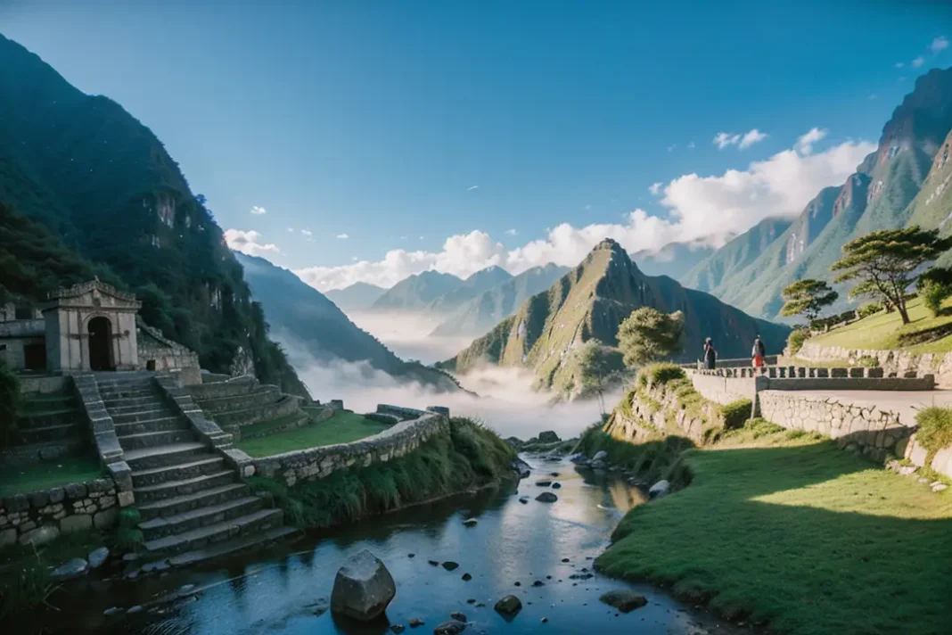 午后,阳光升高,雾气散去,整座古城显露更多细节:石阶凹陷、屋顶轮廓、神庙门扇,都在光影下清晰可见。远处雪山反射白色光芒,天空湛蓝,古老文明与自然的结合达至完美平衡。游客静步石板路上,每一步都小心翼翼,却与这片土地深深共鸣。