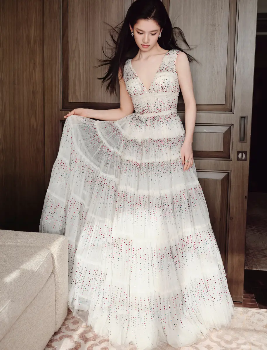 张婧仪的白色纱裙设计独特,轻盈的材质在阳光下散发着柔和的光泽。裙摆的设计令她走动间轻轻摇曳,透露出一丝慵懒的韵味,完美地诠释了「优雅」与「轻松」的结合。这样的搭配无疑让她在活动中成为了最引人瞩目的焦点。