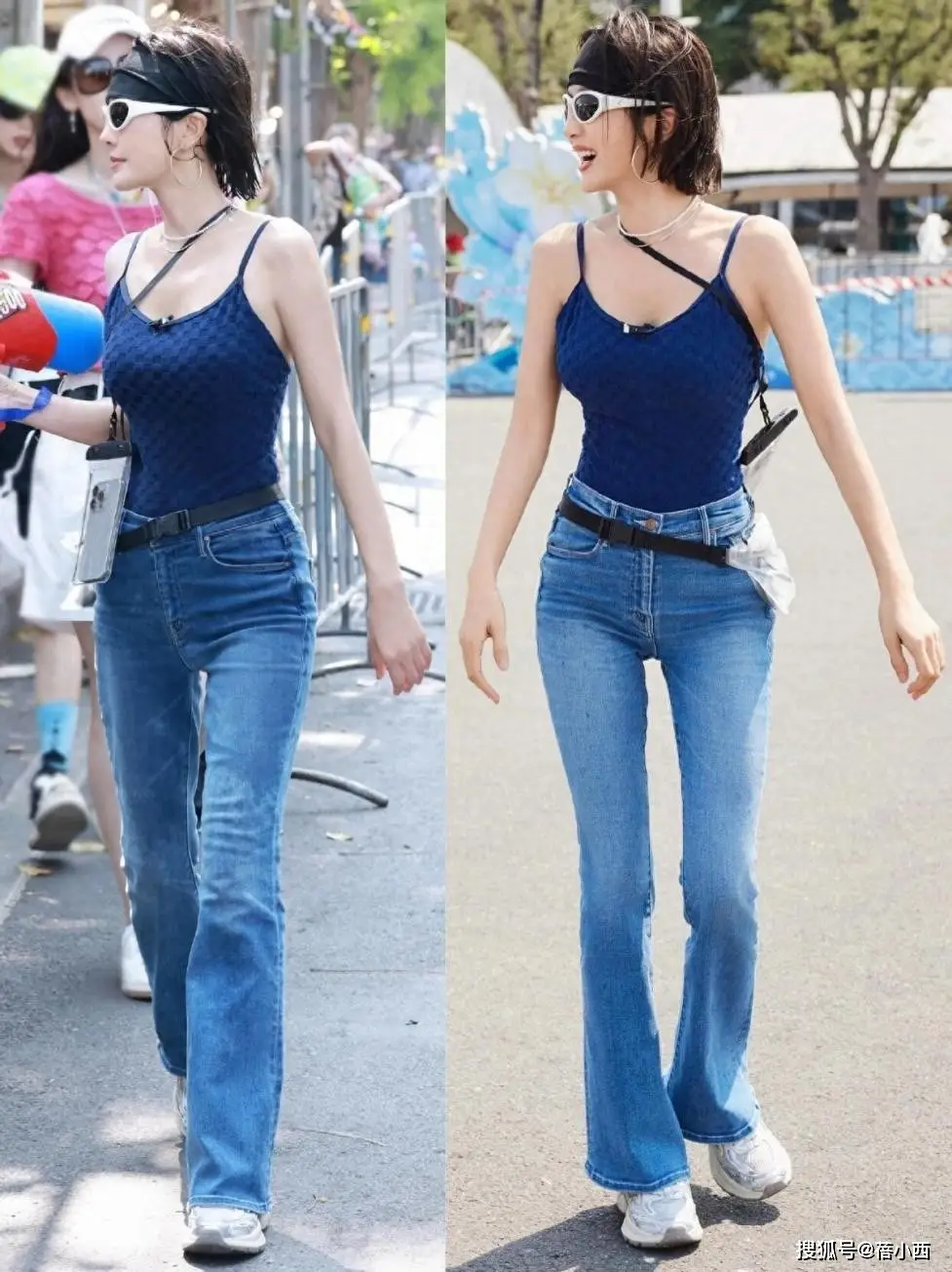 秦岚此造型搭配蓝色微喇叭牛仔裤,裤型修饰腿部曲线,适合腿部紧实的人穿着。喇叭裤从膝盖往下逐渐加宽,即便小腿略有肉感也不影响整体美感。鞋履方面,夏季吊带搭配凉鞋、拖鞋或休闲鞋都十分合适,随性又具时尚感。