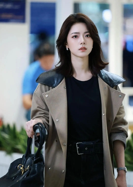 在《无可替代》中,她饰演的角色徐迟并非脸谱化的“黑莲花”,而是一个有阶段、有逻辑的职业女性。服装设计显然服务于这一成长轨迹:初期以浅杏色衬衫、烟灰色直筒裤、低马尾示人,传递的是谨慎、适应与试探;随着角色在职场中的位置逐步稳固,雾霾蓝西装套裙、V 领针织衫与中跟鞋的组合,则更强调专业度与自信感的建立。这些细节让角色显得“可被相信”,而非悬浮于现实之外。