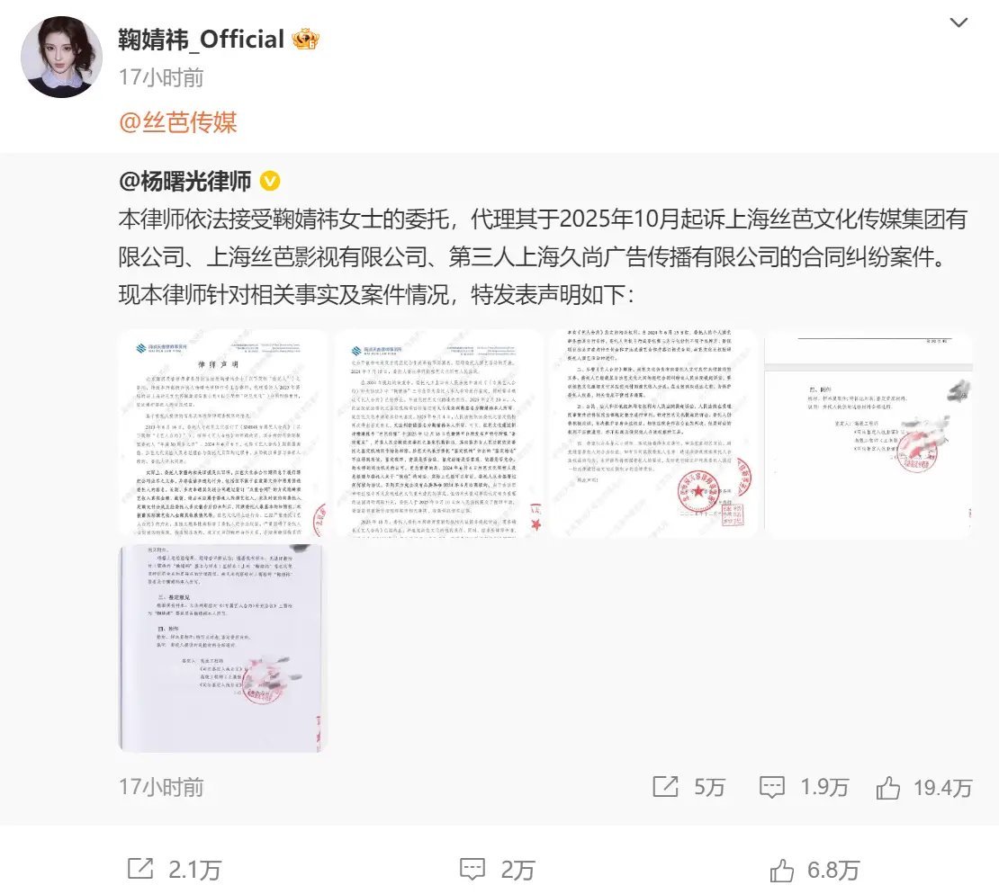 本轮风波的直接导火索,来自丝芭传媒于12月16日下午发布的一则声明。声明中,公司公开了案件阶段性进展,称经司法鉴定,2018年9月10日签署的《专属艺人合约》补充协议中“鞠婧祎”的署名为真实签名,并表示将向法院正式提交鉴定报告,以反驳艺人方面对签名真实性的否认。