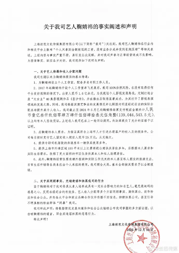 随后,丝芭传媒于当晚再次发布补充声明,披露大量具体数据,强调公司在合作期间对鞠婧祎的投入与回报情况。声明显示,丝芭曾投入约1.6亿元人民币为其规划影视发展路线,并为其量身打造《芸汐传》等重点项目,截至2024年5月,累计向鞠婧祎结算税前收入约1.39亿元。此外,公司还提供固定月薪、专属团队、商务用车、住房等多项保障。