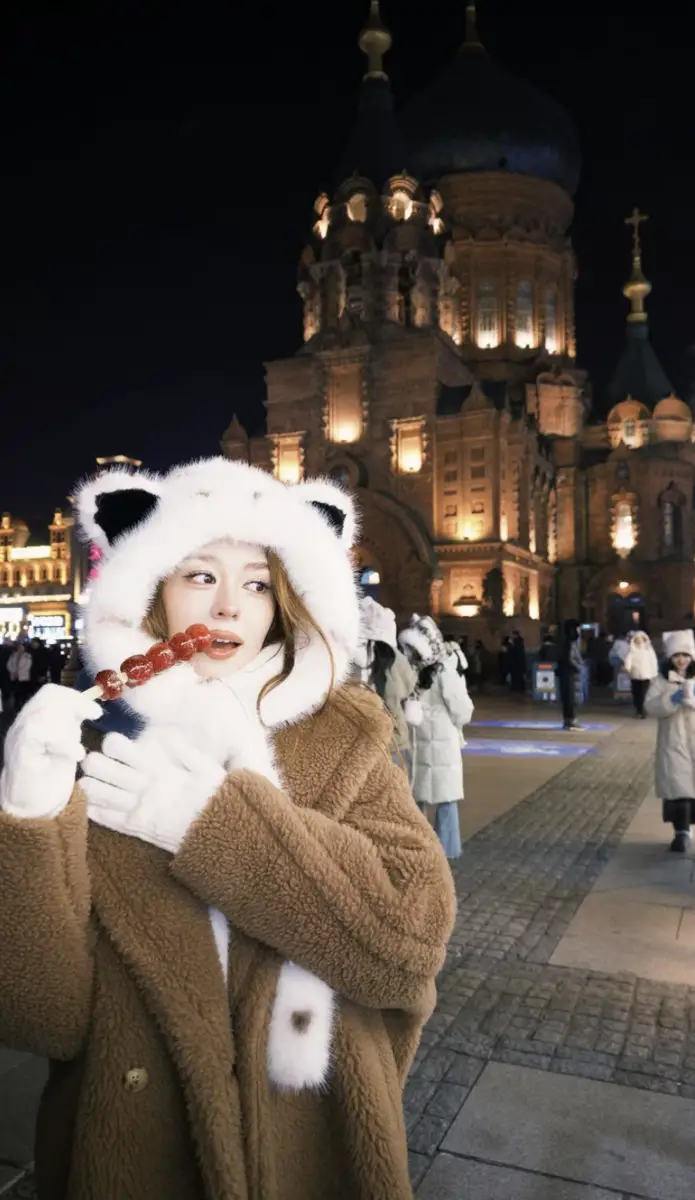 哈尔滨以其独特的冬季魅力而闻名,尤其是在雪花飘落的季节,成为了游客们的理想去处。吉娜选择在这样一个时候来访,自然也展现了这座城市的无与伦比的美丽。她手持一串糖葫芦,增添了几分活泼的气息,仿佛在与游客分享着哈尔滨独有的甜蜜。