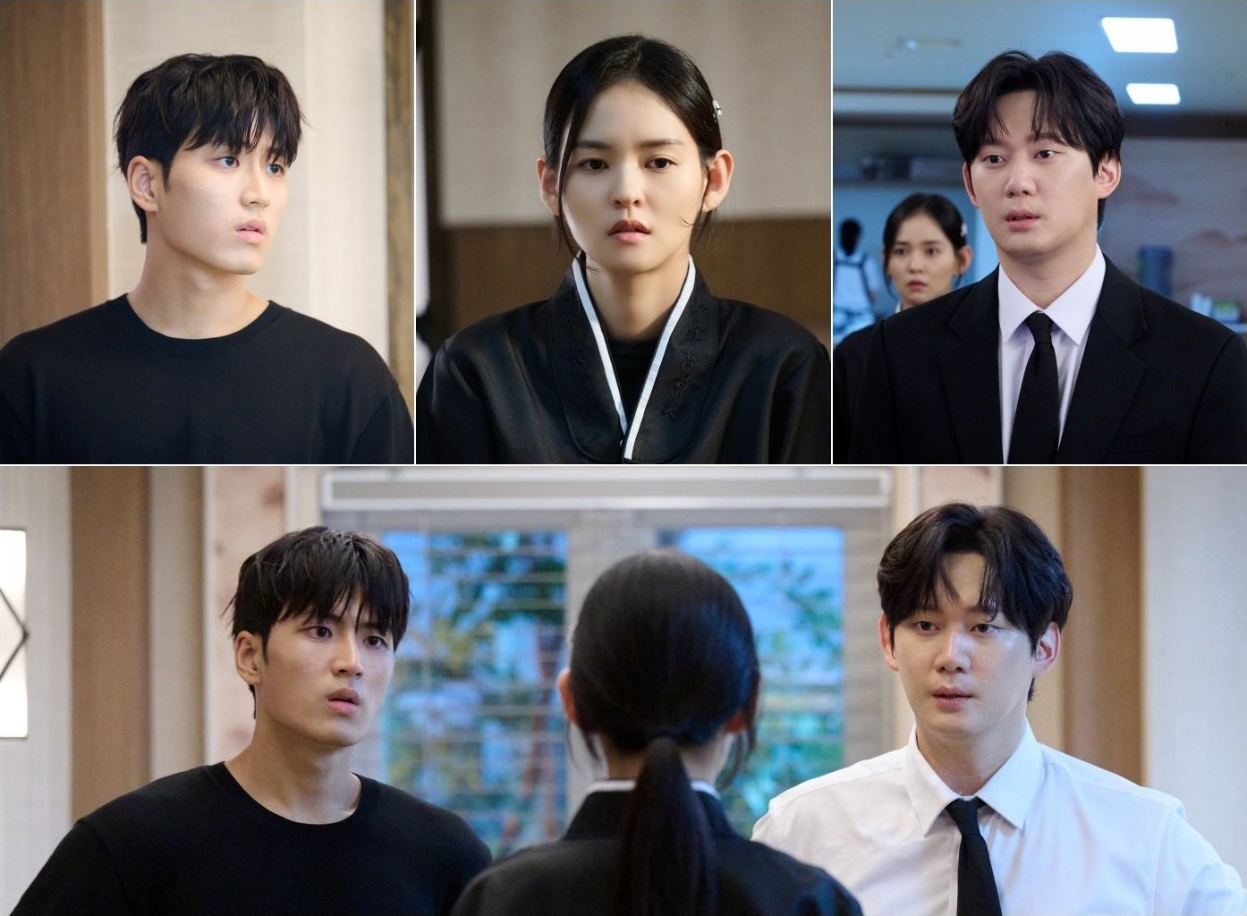 剧照中,身着丧服的秀雅神情犹豫而疲惫。正民以“家人般”的姿态自然融入葬礼现场,让仁浩感到不安与疏离;而正民则坚信,自己才是最有资格陪伴秀雅度过这一时刻的人。两位男性之间的紧张关系最终爆发冲突,也迫使秀雅直面内心,做出无法回避的选择。