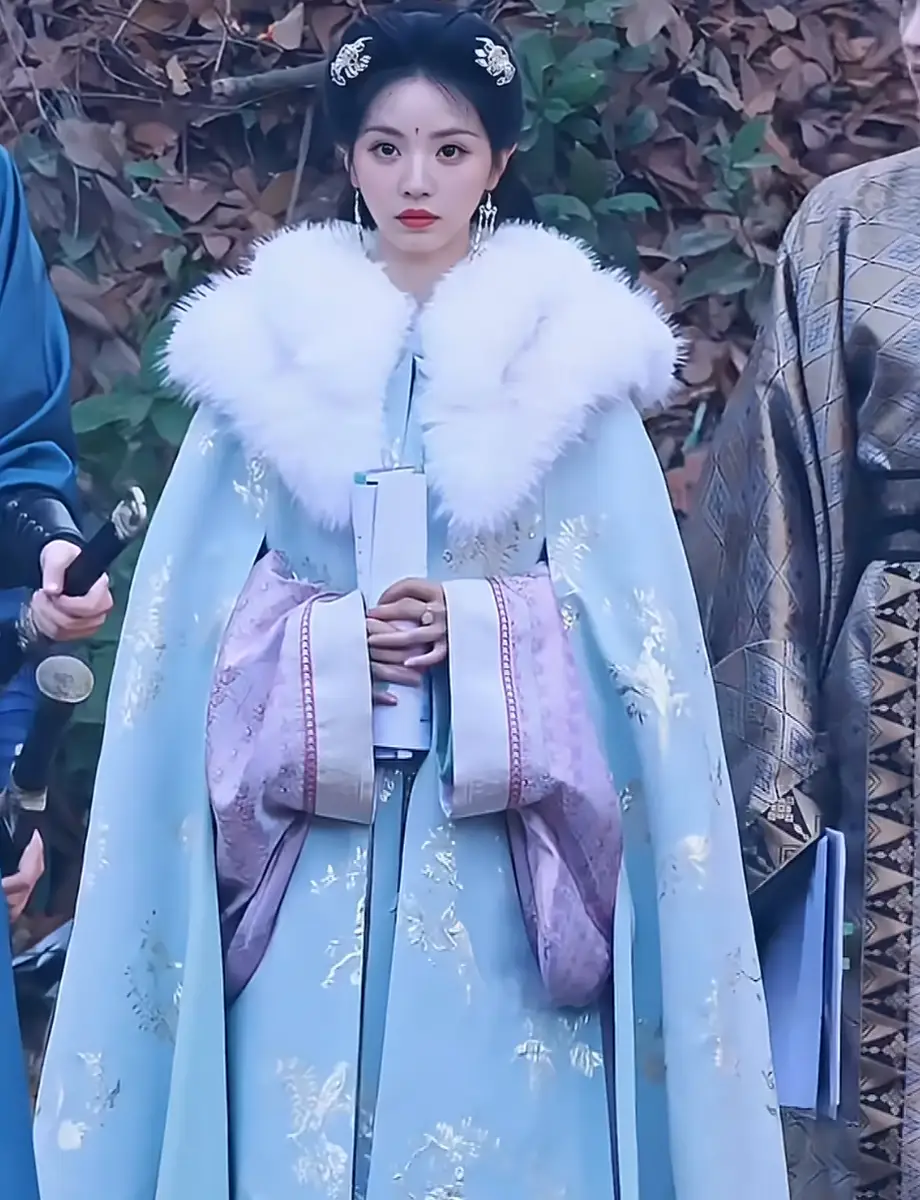 田曦薇此次选择了一套浅蓝色的古装,搭配白狐毛领,使得整体形象更加高贵典雅。这样的色调不仅衬托出她清新的气质,还增添了一份冬日的温暖与柔和。在拍摄现场,她的每一个细节都散发出温婉的氛围,使观众对她在剧中的表现充满期待。