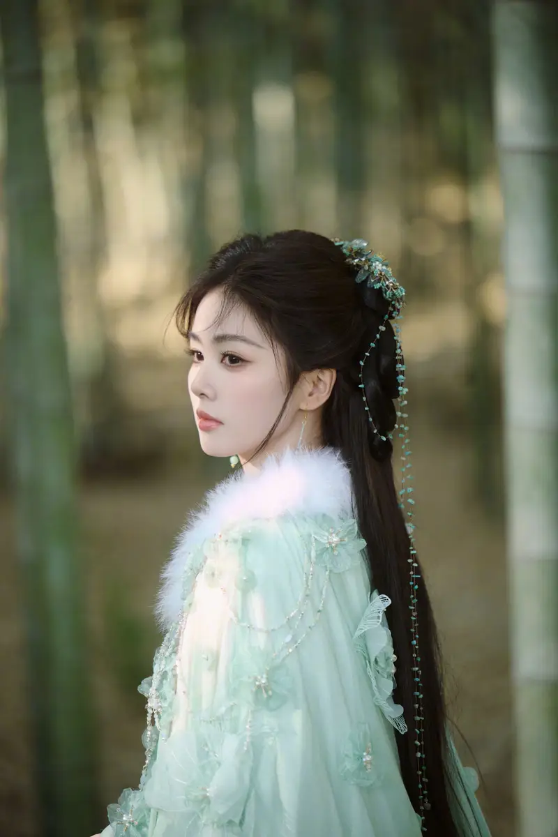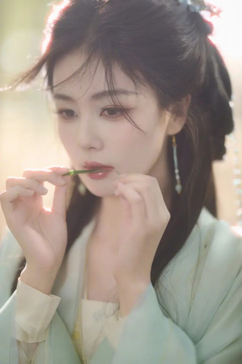 浅绿色襦裙线条流畅,色调柔和,不张扬却极具辨识度。服装以传统古风为基底,在剪裁与层次上强调轻盈感,使整体造型既保留古典韵味,又不失现代审美中的简洁与通透。白鹿眉目如画,神情温婉,多情却不流于浓烈,展现出含蓄而稳定的情绪表达。