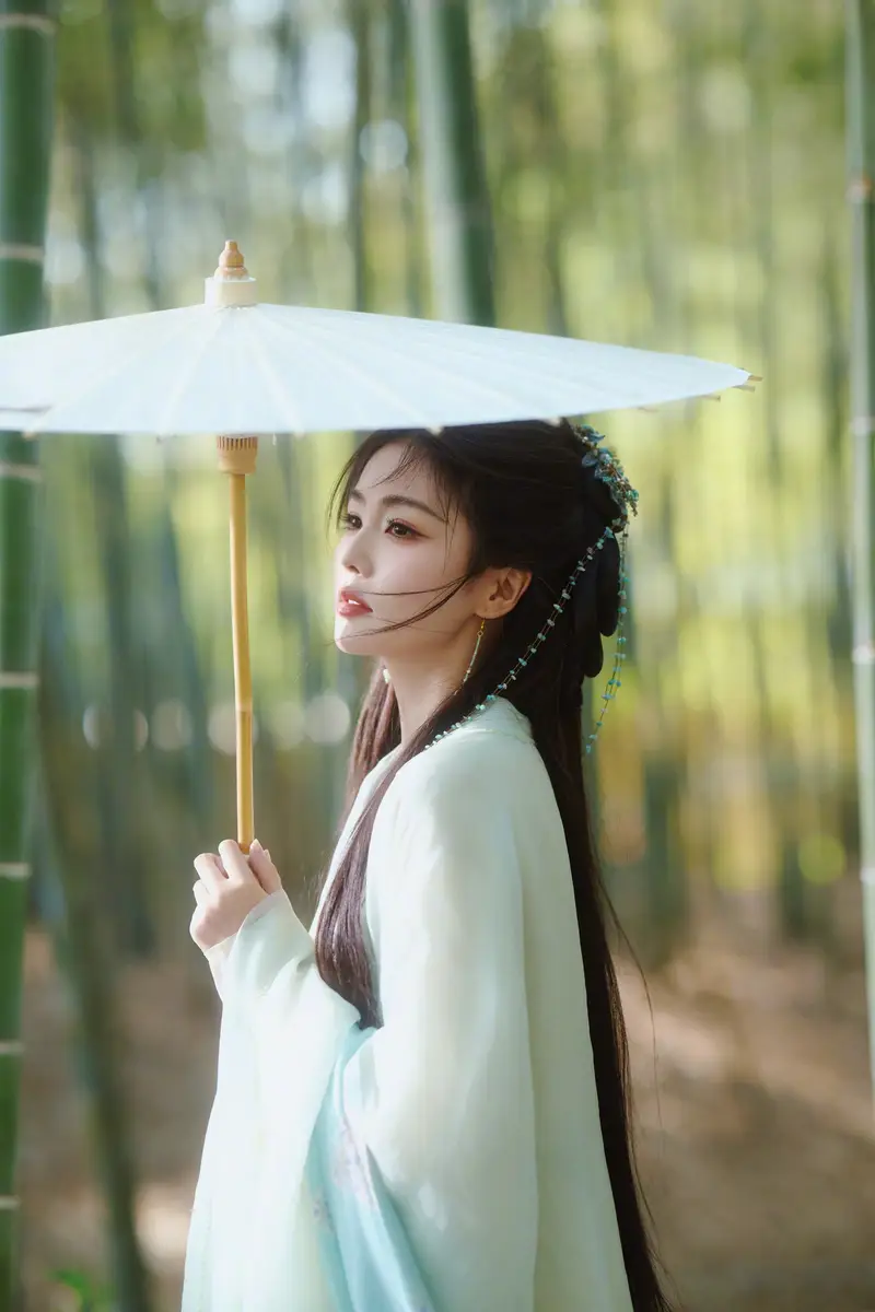 在部分画面中,白鹿撑伞垂眸,目光内敛,气质显得清冷而疏离。这样的姿态并非刻意塑造距离感,而是一种安静、自持的美学呈现。她站在竹林之中,背景的自然元素与服装色调相互呼应,竹影疏朗,人物气质如兰,整体画面显得从容而纯净。