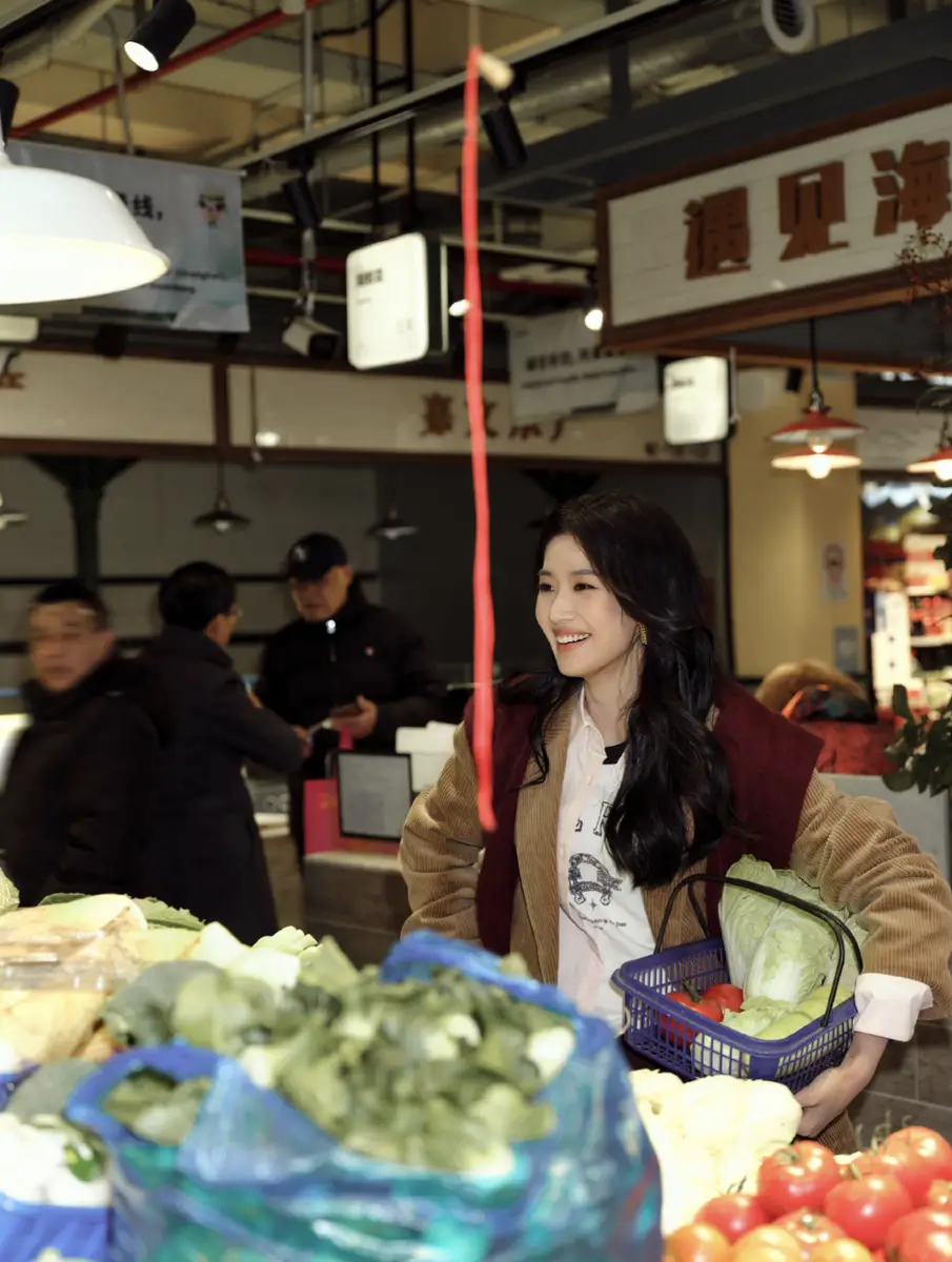 在菜市场的摊位前,卢昱晓身着棕红系穿搭,风格随性舒适。她手提菜篮,眉眼弯弯,笑意自然流露,生活气息扑面而来。这一画面没有修饰过多情绪,却因真实而动人,仿佛新年的喜悦正藏在这些最平凡的场景中。