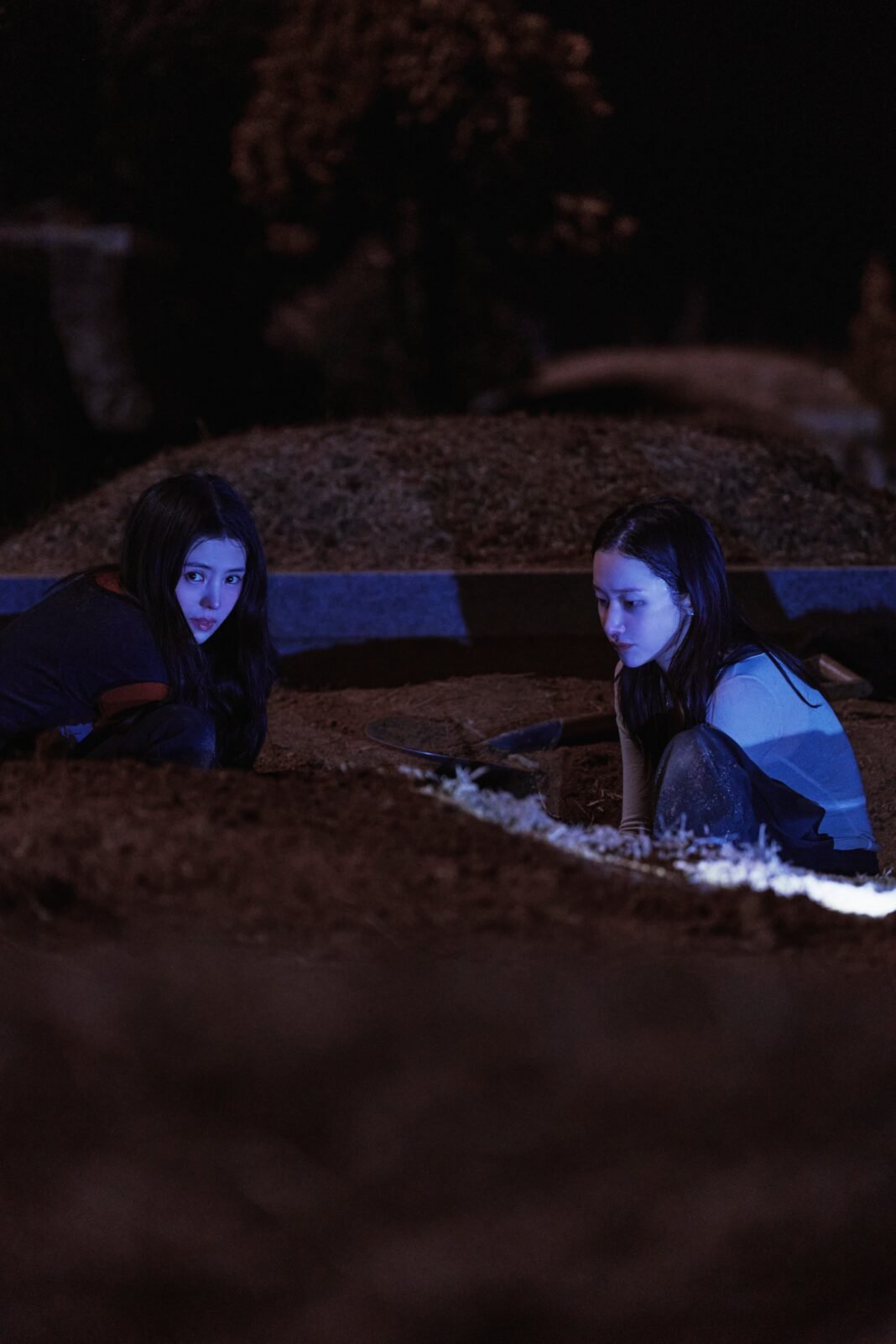 其中一張劇照中,兩人彼此對視,畫面略顯模糊,象徵她們即使身處危機,也始終選擇站在同一陣線。另一張畫面則描繪她們汗流浹背地在墳墓之間挖掘,暗示計畫背後潛藏的巨大危險與未知後果,也引發觀眾對結局的諸多猜測。