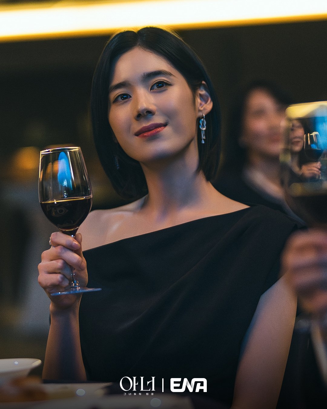公开的剧照从多个侧面展现了姜信载的气质与层次。在干练利落的西装造型中,她目光坚定,展现出在任何局势下都不轻易动摇的气场;而在社交场合中手持酒杯、神情从容的画面,则流露出成长于法律世家的优雅与自信。工作状态下,她专注而锐利的眼神,进一步强化了角色在专业领域中的权威感。