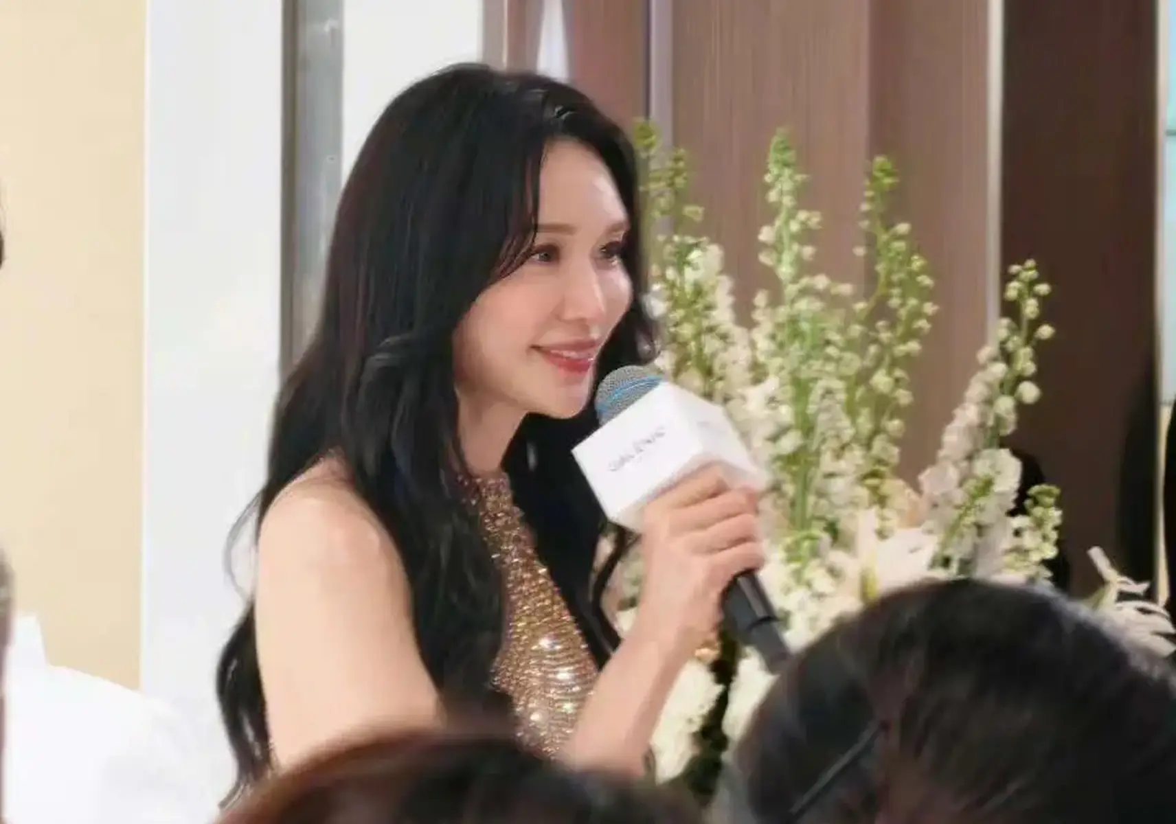 她身着金色挂脖亮片裙,在灯光下缓步而行,衣料折射出的细碎光芒并不张扬,却足够温柔。她站定,看向镜头,浅浅一笑,像一阵不急不缓的风。