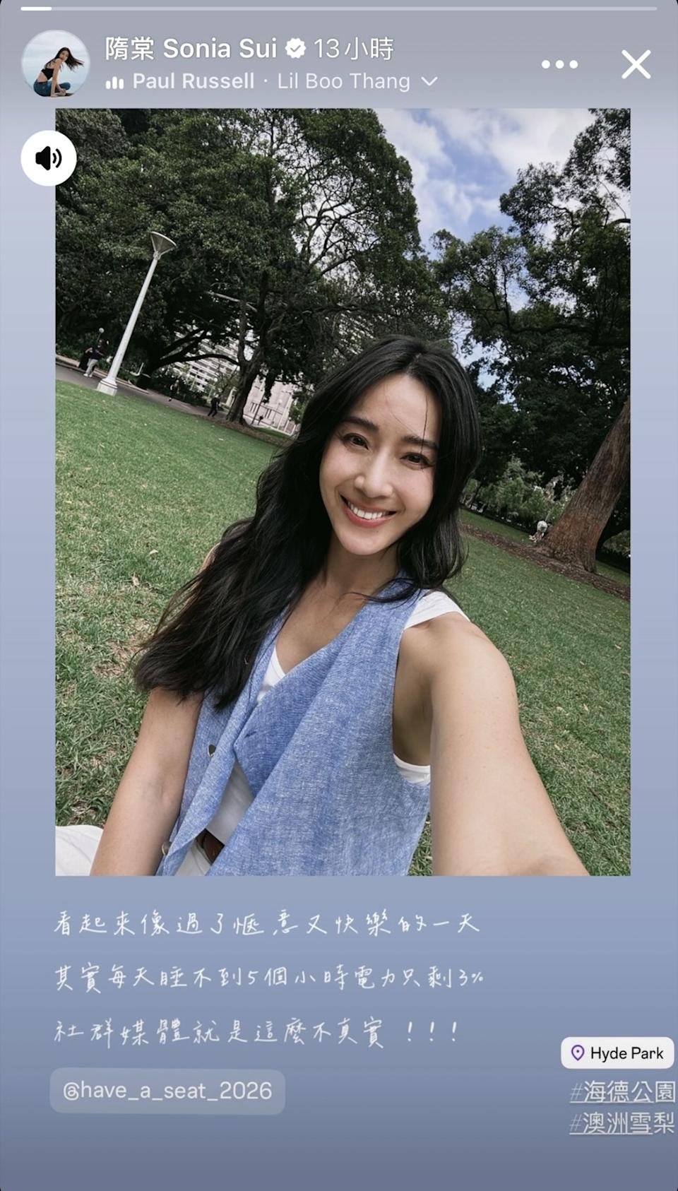 22 日,隋棠透過臉書限時動態上傳自拍照,背景為澳洲雪梨的海德公園。照片中,她身穿藍色無袖背心,長髮自然披落,在藍天白雲與大片草地的映襯下,整體氛圍輕鬆自在,彷彿正享受一場悠閒的旅程。
