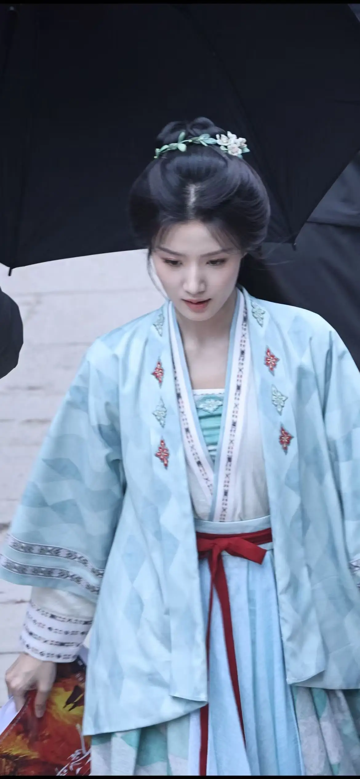值得注意的是,卢昱晓自身的面部轮廓与整体气质,为这一类偏清冷、内敛的古装人物提供了良好的视觉基础。宽袖、交领等传统服装结构在她的呈现下显得自然顺畅,未显刻意堆砌。路透中衣料的暗纹、层次变化,以及人物行走时的动态效果,都强化了造型的整体完成度。