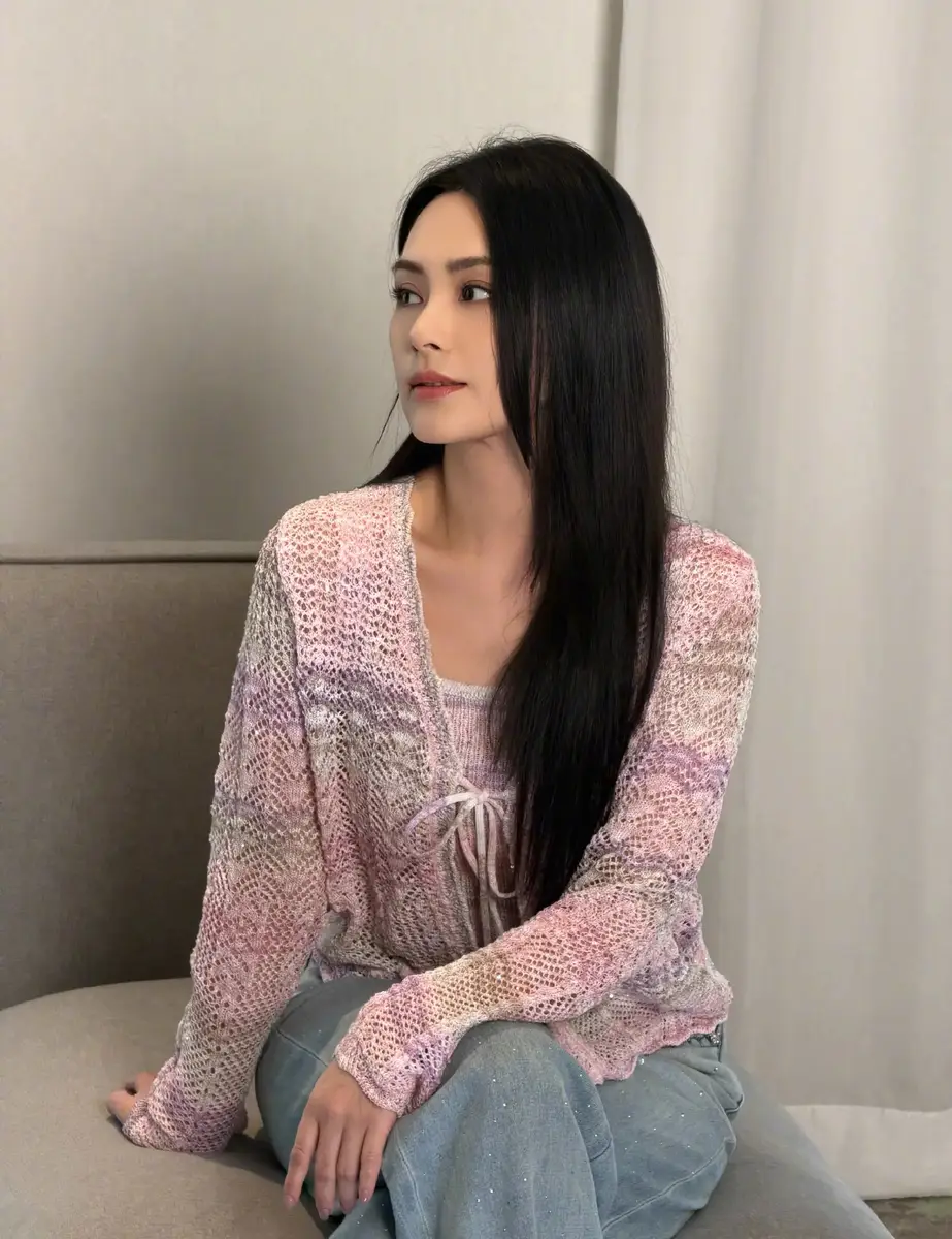 ”照片中,她身穿粉紫色针织衫,搭配浅蓝色牛仔裤,整体造型清新柔和,呈现出自然甜美的气质,状态显得轻松而自信。