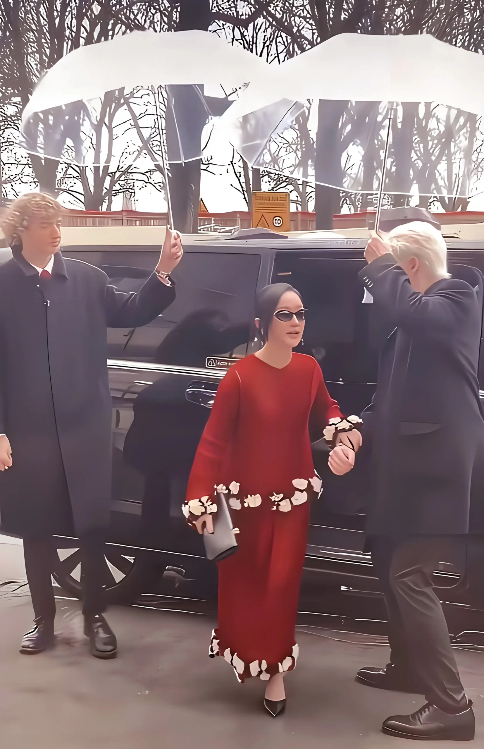 在抵达秀场时,主办方安排工作人员为其撑伞迎接。尽管当日并无降雨或强烈日照,这一细节更多被解读为时装周礼仪与舞台调度的一部分,也在视觉上强化了她的核心地位。周迅身形纤巧,在高挑人群中显得格外醒目,与整体造型形成鲜明对比。