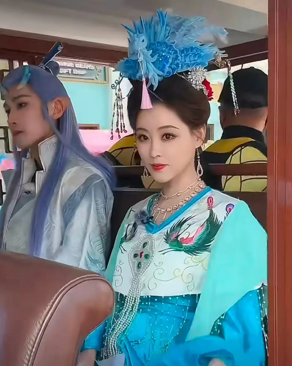 祝绪丹头戴蓝羽发冠,羽饰线条轻盈,为整体造型增添了灵动感,也衬托出人物娇俏明艳的气质。她端坐在巡游车上,姿态从容,古装造型在光线映衬下显得格外亮眼,画面氛围明快而和谐。