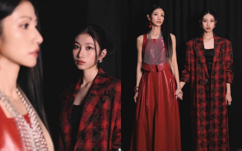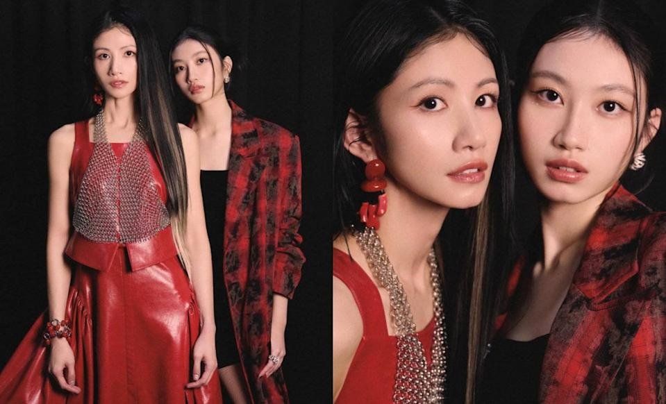 顾颖则选择了截然不同的风格。她以红黑刷纹长版外套搭配黑色平口内搭现身,整体造型偏向冷调与时尚感,展现出沉稳而不刻意的气质。面对镜头,她的表现自然从容,在年轻之中带有成熟度,成功塑造出鲜明的个人存在感。