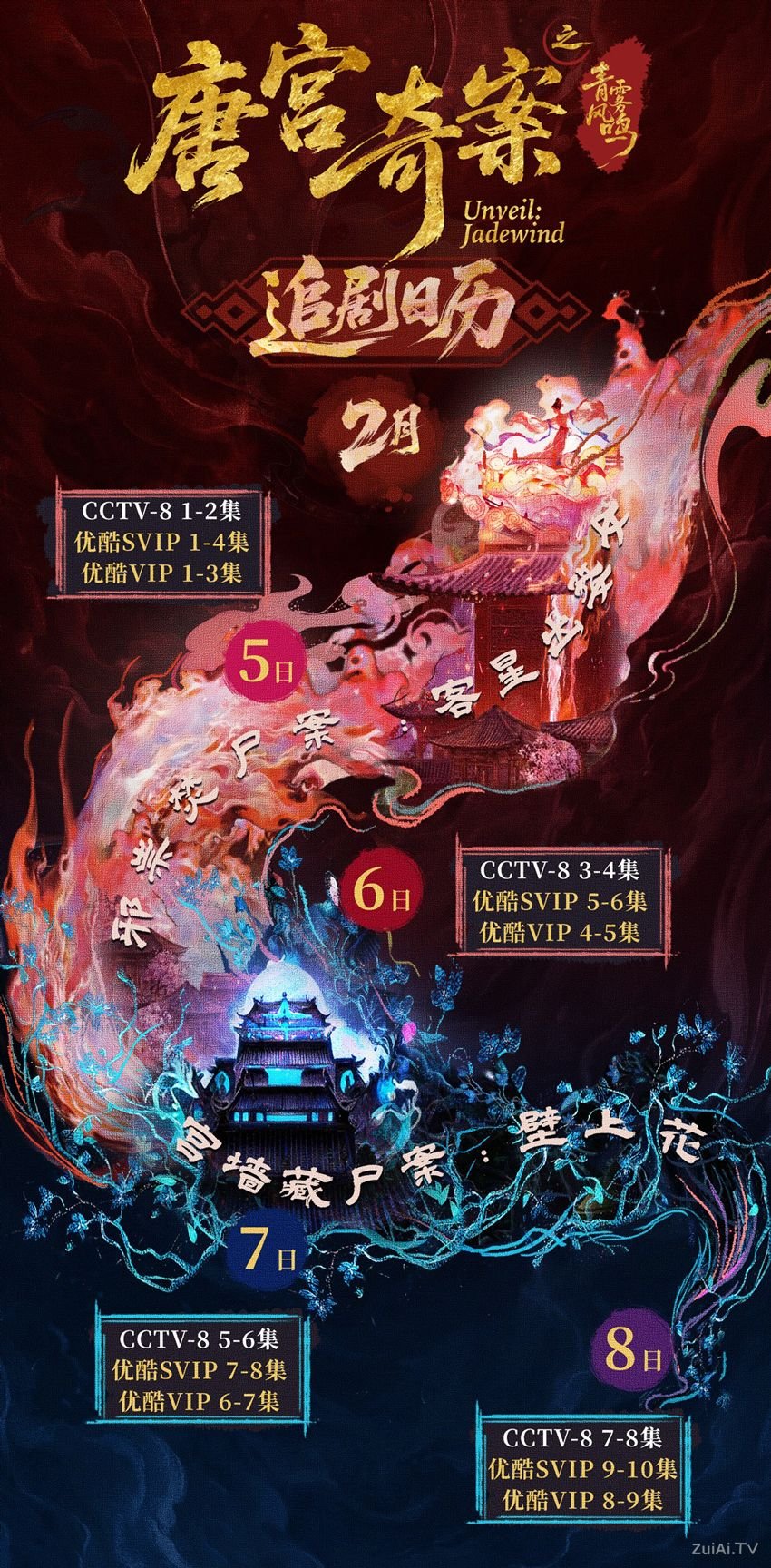 播出安排方面,《唐宫奇案之青雾风鸣》将于2月5日起在CCTV-8每晚21:30播出,首日播出两集,随后每日更新两集,预计2月21日迎来大结局。同步上线的会员版本首日更新三集,其后每日更新两集,非会员更新规则尚待公布。