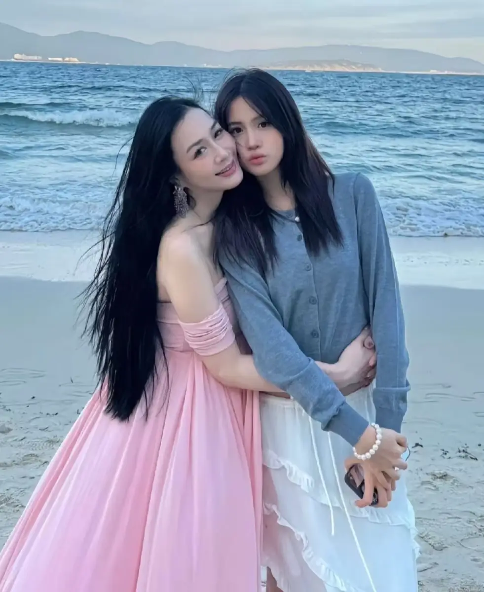 其中一张母女合影尤为引人注目。画面里,钟丽缇与 Cayla 在海边相拥,母亲身穿粉色长裙,造型温柔大方,母女之间的亲密互动为画面增添了几分柔软与感动。
