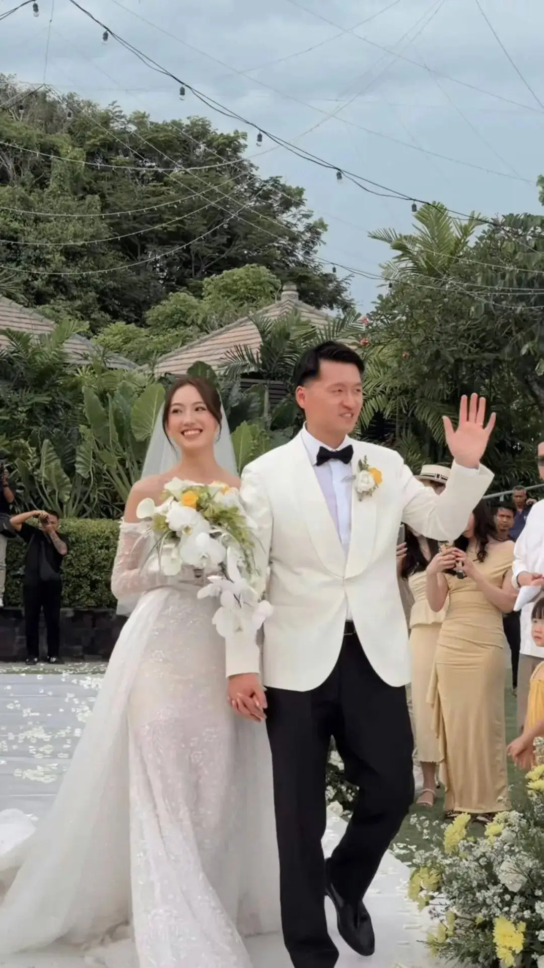 完成中式仪式后,杨咏彤换上白色低胸婚纱,于巴厘岛海边的露天场地举行西式婚礼。在蓝天、海岸与亲友祝福的映衬下,她与丈夫完成婚礼仪式并许下誓言,画面浪漫而自然。其178厘米的身高与模特比例在婚纱造型中尤为突出,与身材高大的丈夫同框显得十分登对。