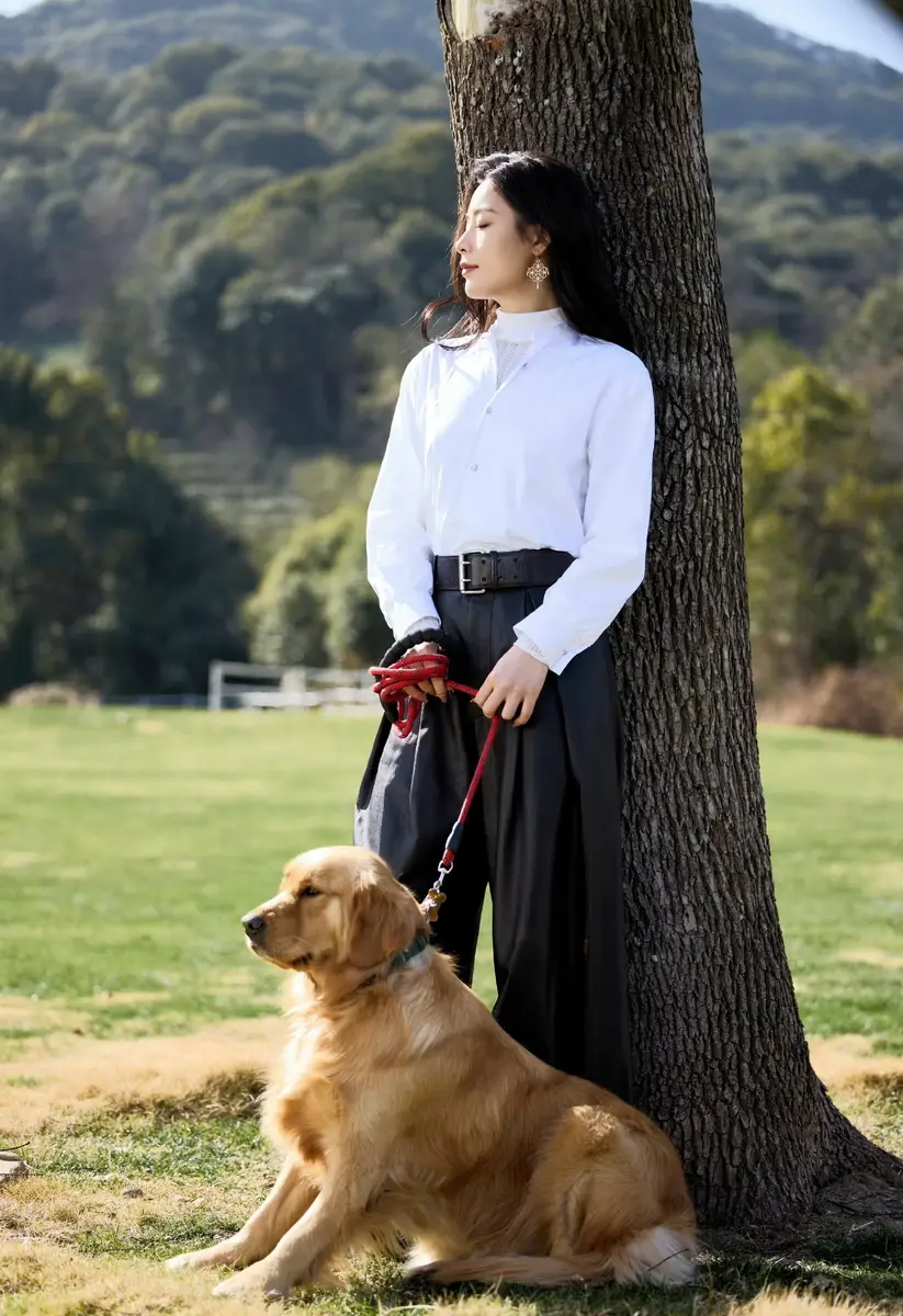 画面中,她牵着金毛在草地上奔跑,神态自然,笑容舒展,举手投足间尽显随性与飒爽。人与宠物之间的互动让照片更添生活气息,也让整体氛围更加真实亲切。倚树而立的瞬间,则呈现出松弛安静的一面,自然光线洒落,营造出温柔而自在的氛围感。