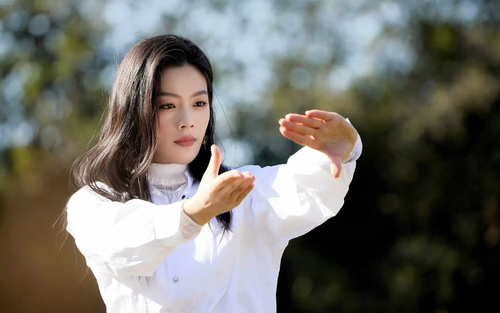 在草坪上漫步时,陈丽君身穿白衬衫,更显整体造型的利落与轻盈。简约的穿搭并未刻意强调装饰,却通过剪裁与质感展现出沉稳与自信。黑色皮裤为整体造型增添了一丝酷感,使清新的白色元素多了几分力量与个性。