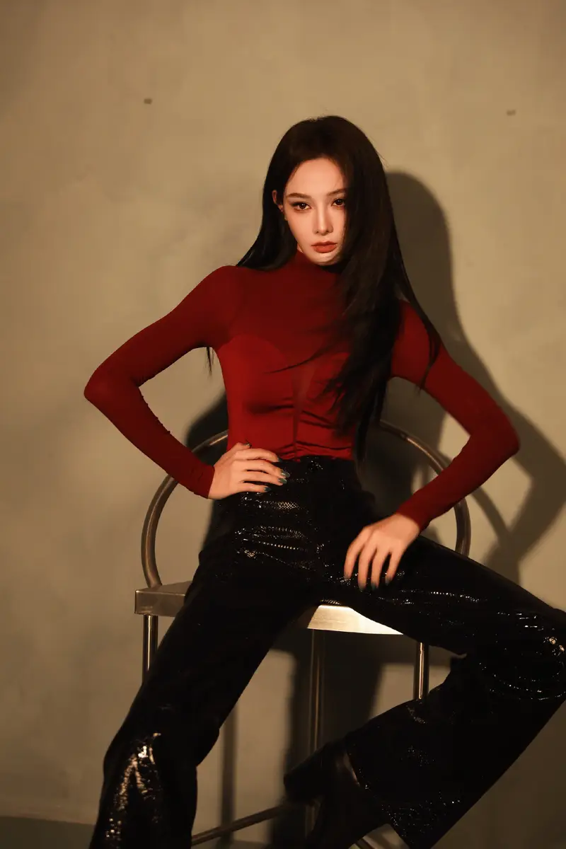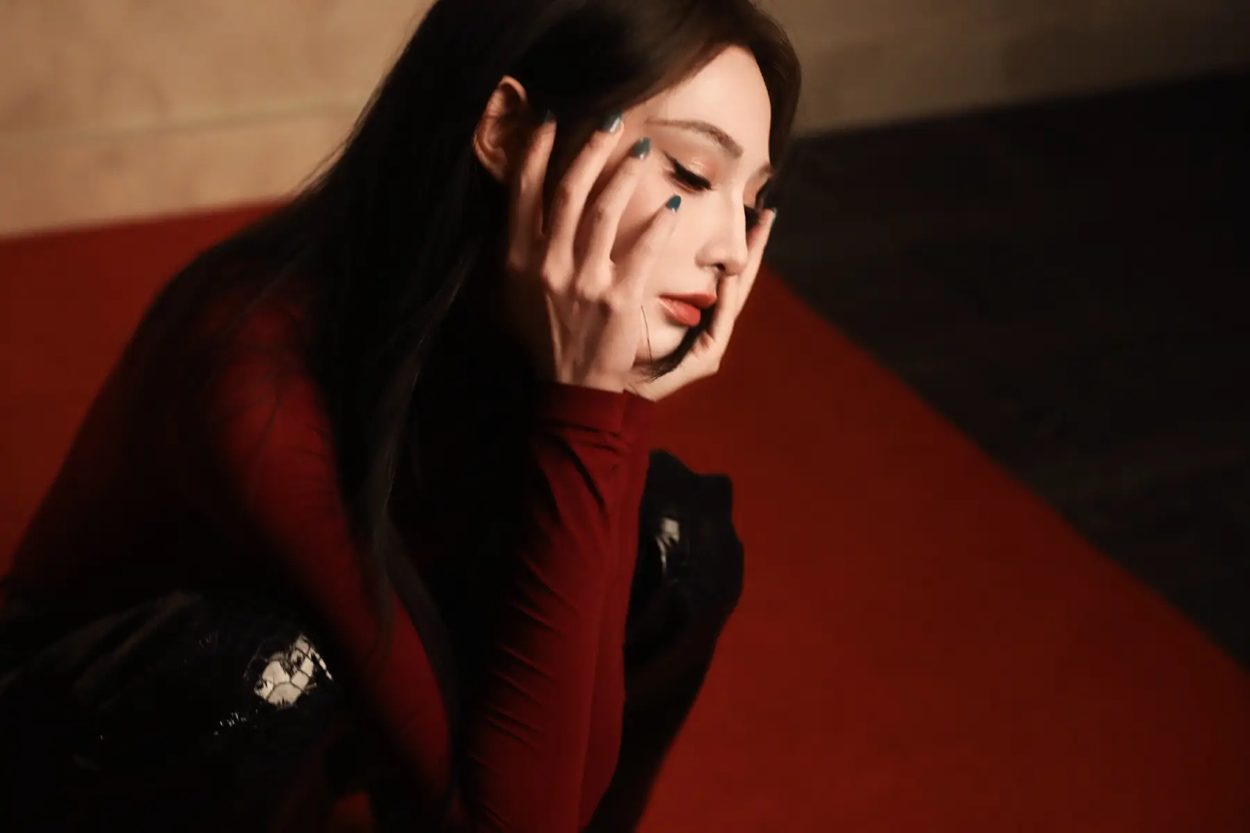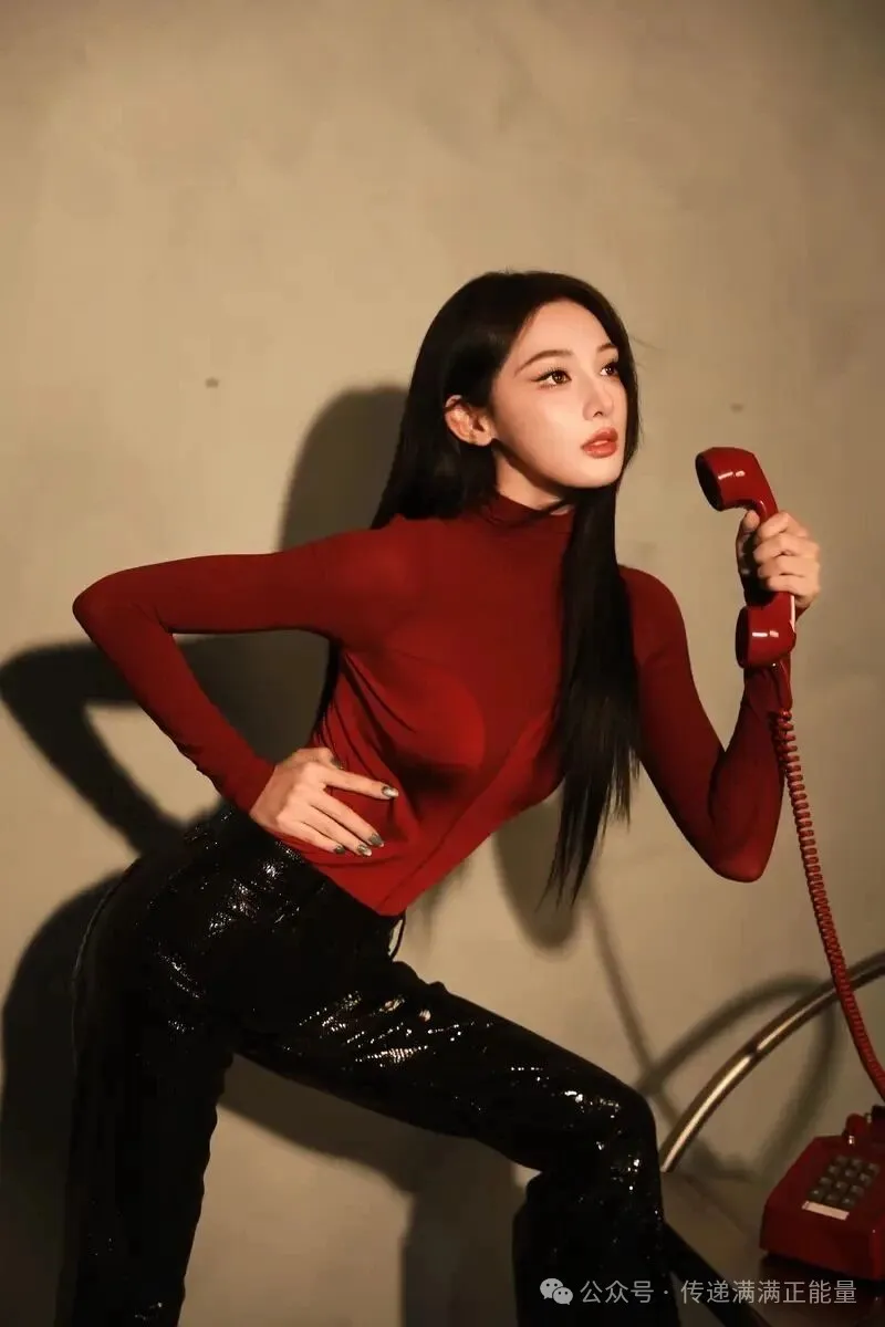 红黑配色本身具有强烈的对比效果,在彭小苒的演绎下显得格外协调。紧身剪裁勾勒出流畅身形曲线,银色美甲作为细节点缀,为整体造型增添冷冽质感。她抬头扬眸的瞬间,神情冷艳中带着灵动,让画面更具层次,也赋予复古风格更多现代气息。