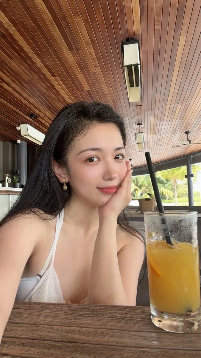 在吊床上的画面尤为惬意,她随意躺靠,神情放松,呈现出假日特有的慵懒与松弛。白色长裙随着姿态自然垂落,增强了轻盈感与流动感,让海岛氛围更加完整。托腮对镜甜笑的瞬间,则多了几分亲切与温柔。