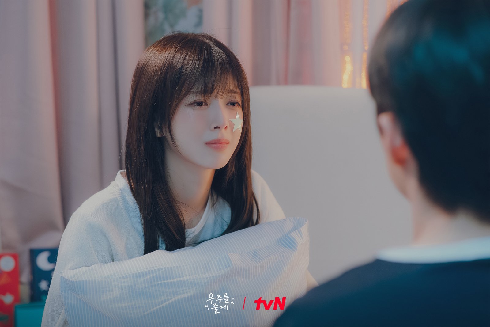 新公开的剧照展示了“同床醒来”前一晚的情景。两人坐在同一张床上对视,脸颊微红,仿佛微醺后的坦诚时刻。贤真脸上贴着夜光星星贴纸,眼含泪光;泰亨则以温柔目光注视着她,气氛暧昧而微妙。那晚究竟发生了什么对话,又为何会在同一张床上醒来,成为观众关注焦点。