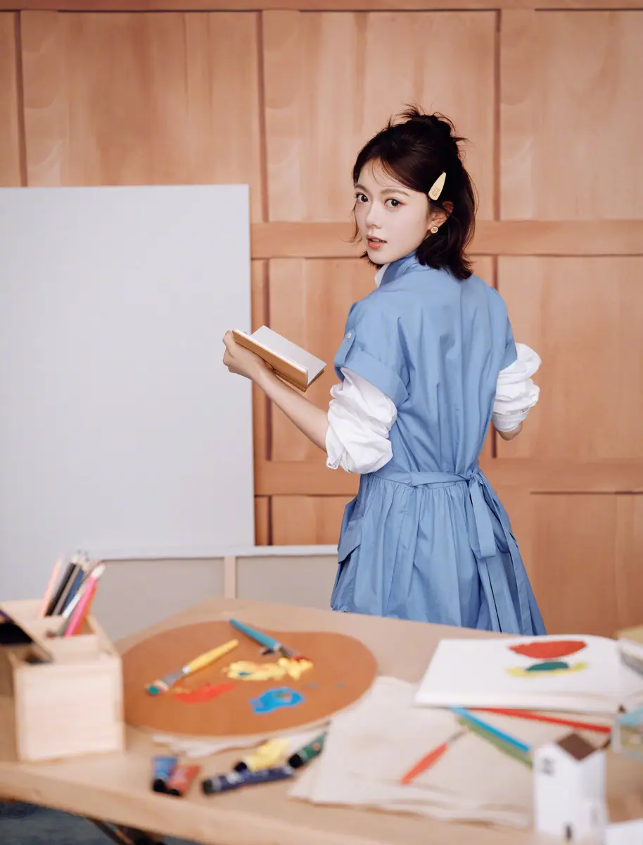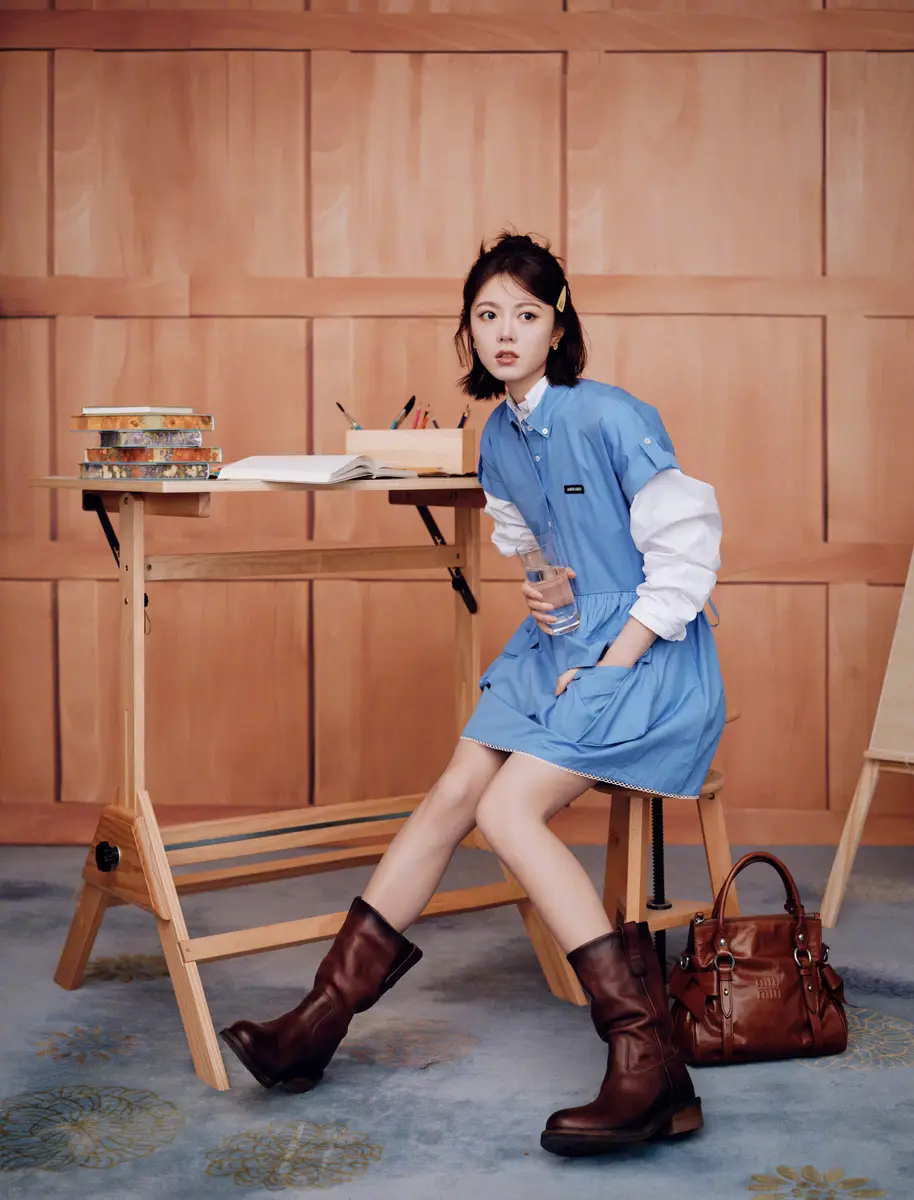 在不同镜头下,赵今麦或坐在凳子上手拿水杯,气质温柔甜美;或托腮凝望镜头,神态自然治愈;又或咬着彩铅翻看画册,流露出少女般的娇憨与灵动。蹲身拎着棕色包包的画面,则为整体造型增添一丝复古俏皮感。