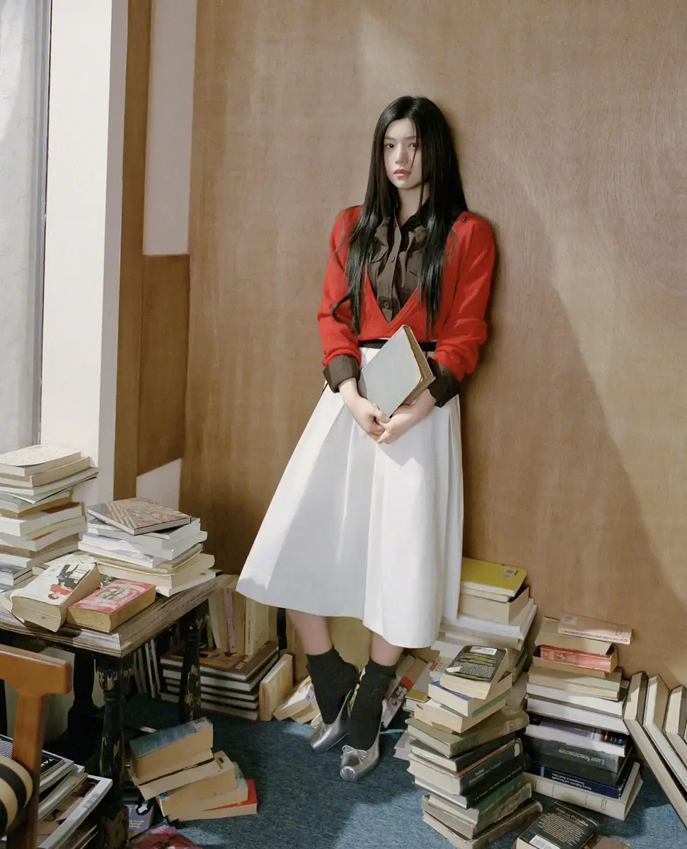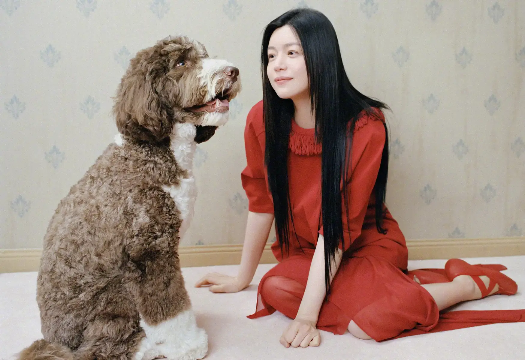 照片中,她或坐于沙发之上,神态温柔沉静,文艺气息十足;或身穿红裙倚墙而立,单手托头,气质明艳又从容。与狗狗对视的画面则显得格外温柔亲切,流露出自然随性的亲和力。