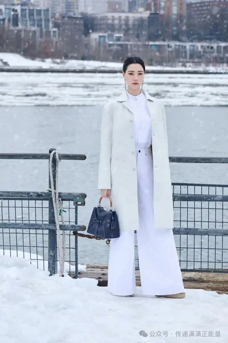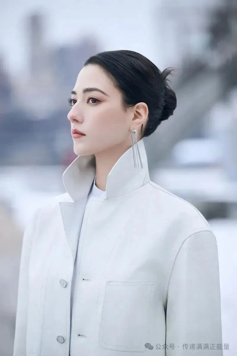 利落剪裁的白色套装勾勒出修长身形,布料自然垂落,带着恰到好处的分量感。长流苏耳饰随着动作轻轻晃动,为整体造型增添一抹精致与贵气。倚靠栏杆时,她身姿舒展,线条流畅;侧头凝望的瞬间,神情清冷克制,却又不失锋芒。回眸望向镜头的画面更显干练飒爽,在极简的色调中展现出独特的个人气场。